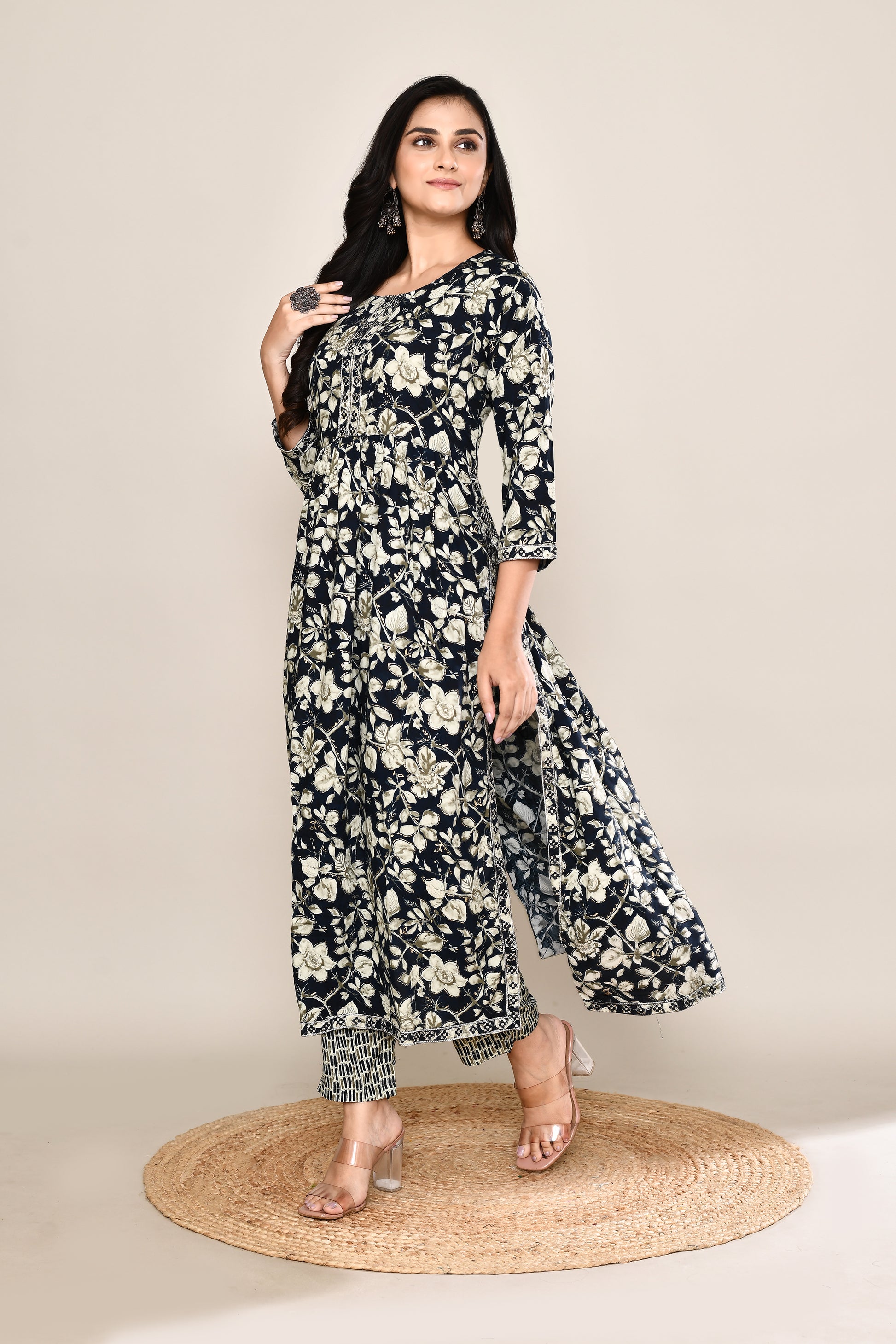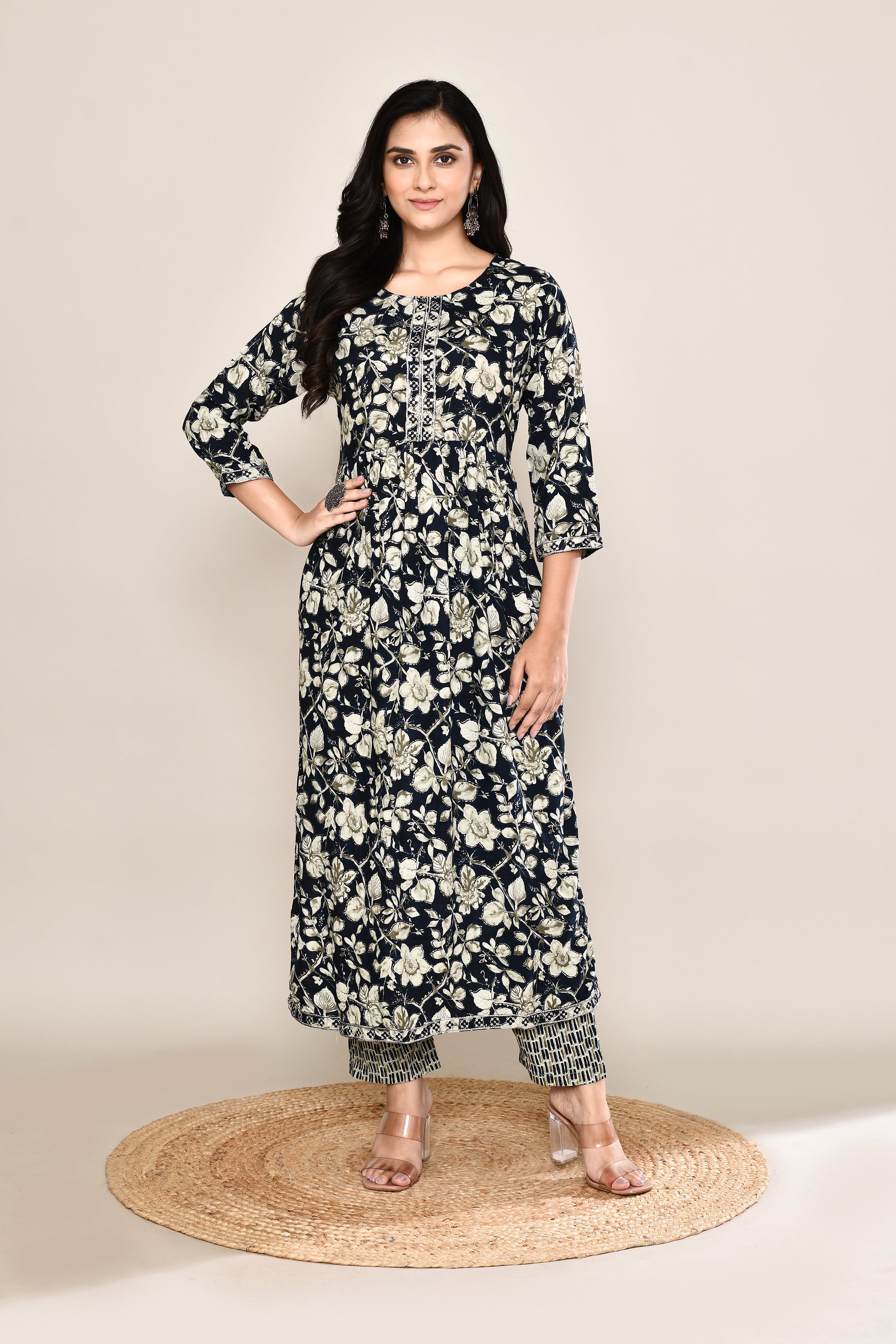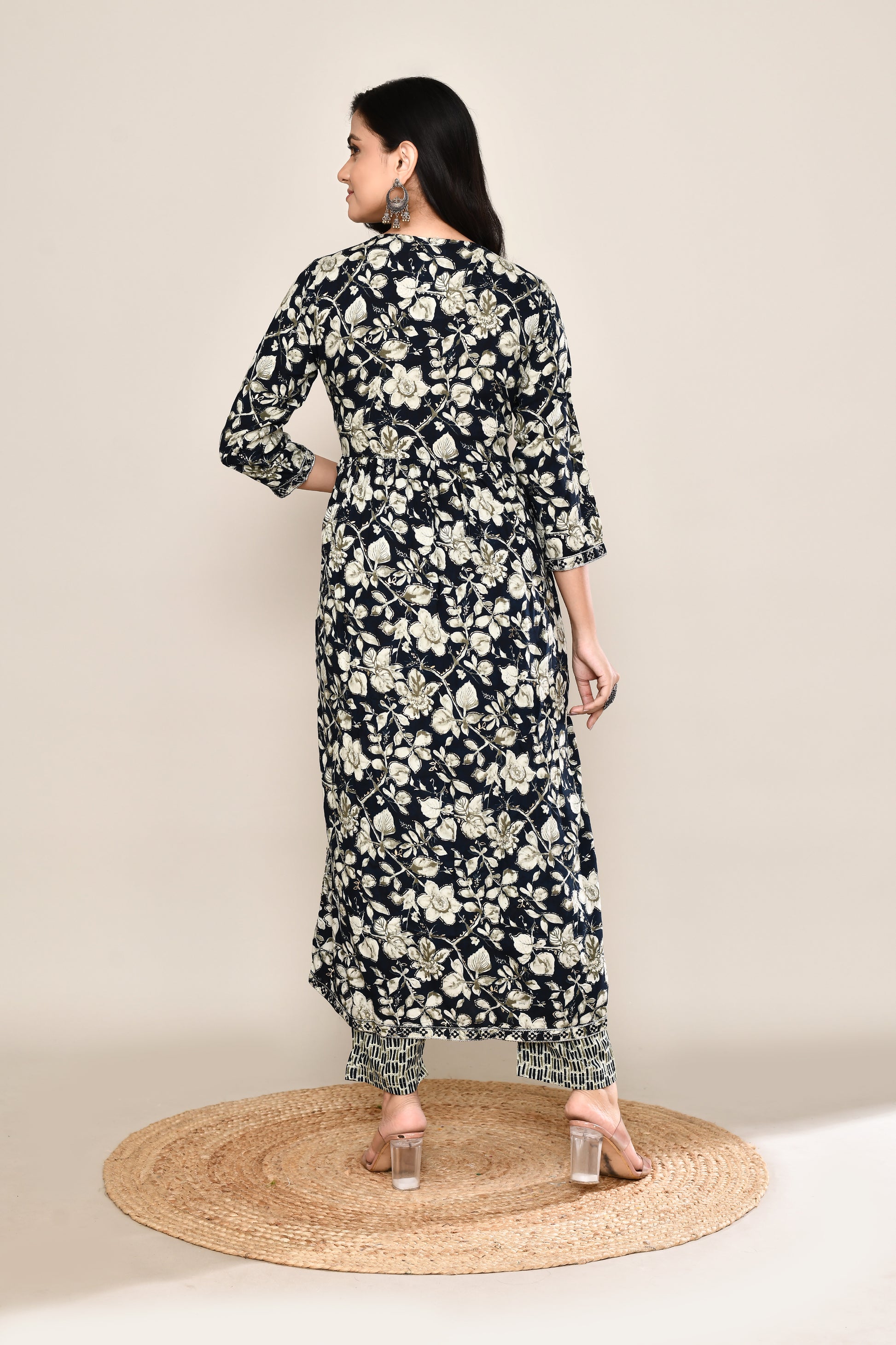Midnight Blue Floral Printed 2 Pc Set with High Slit and Printed Pants