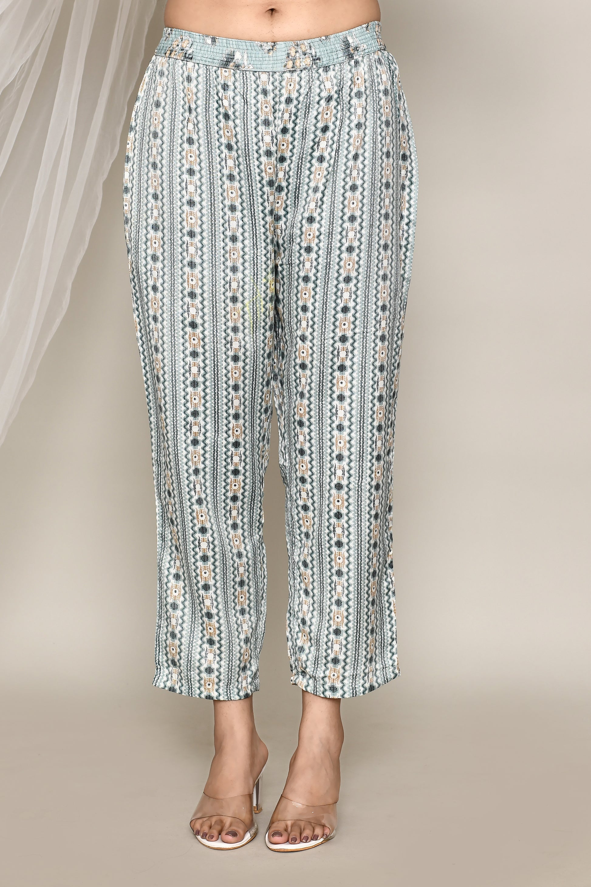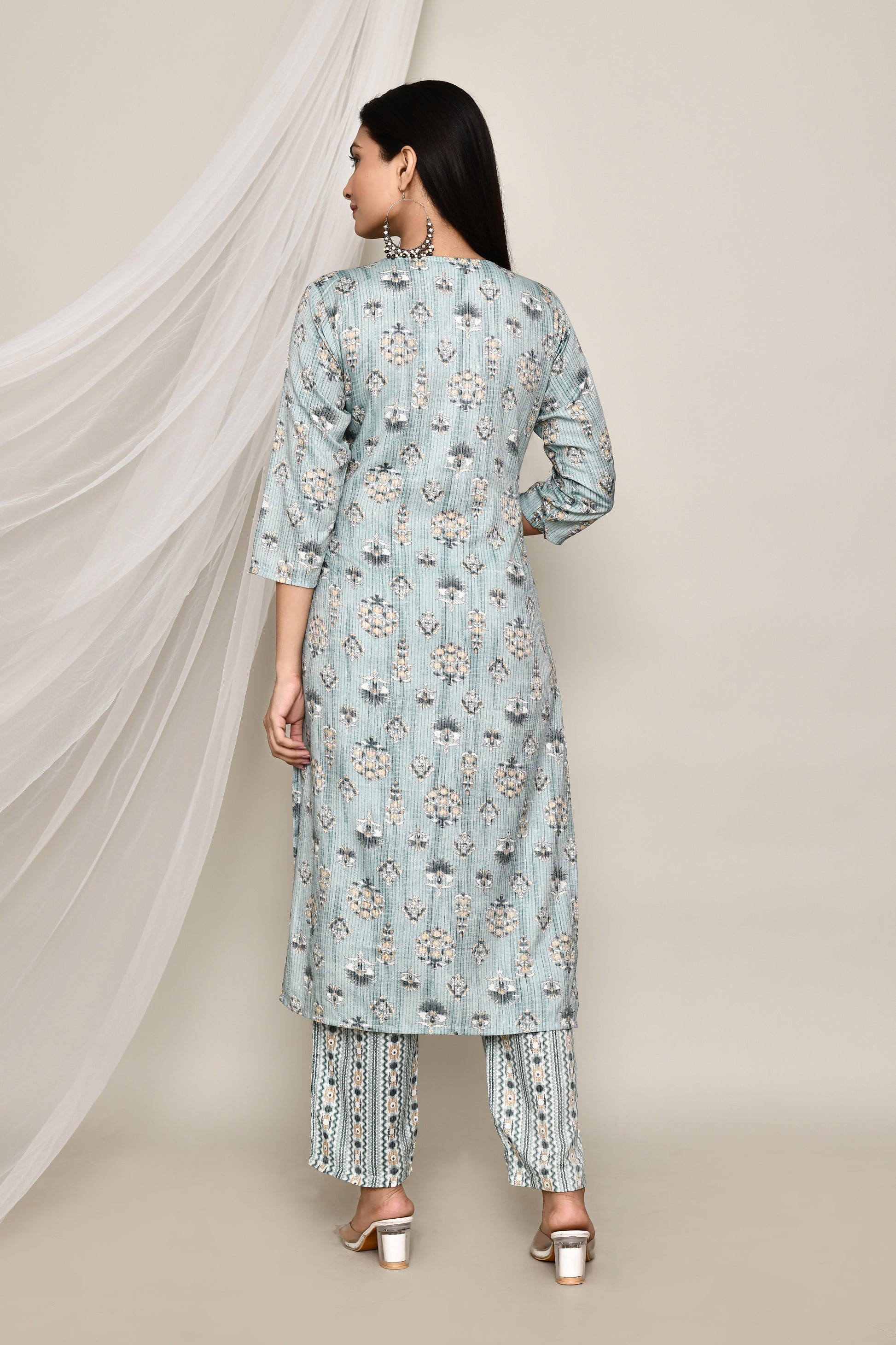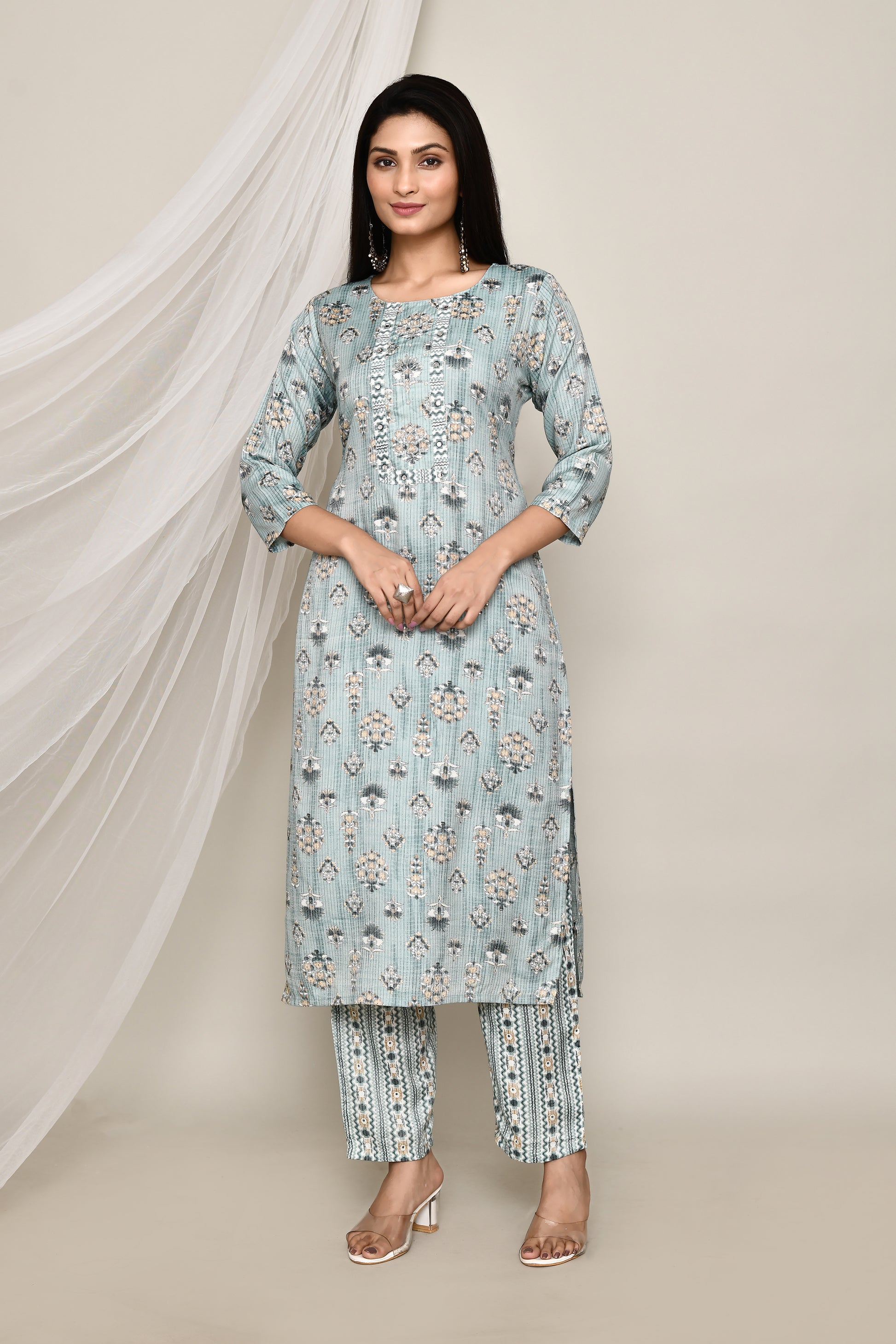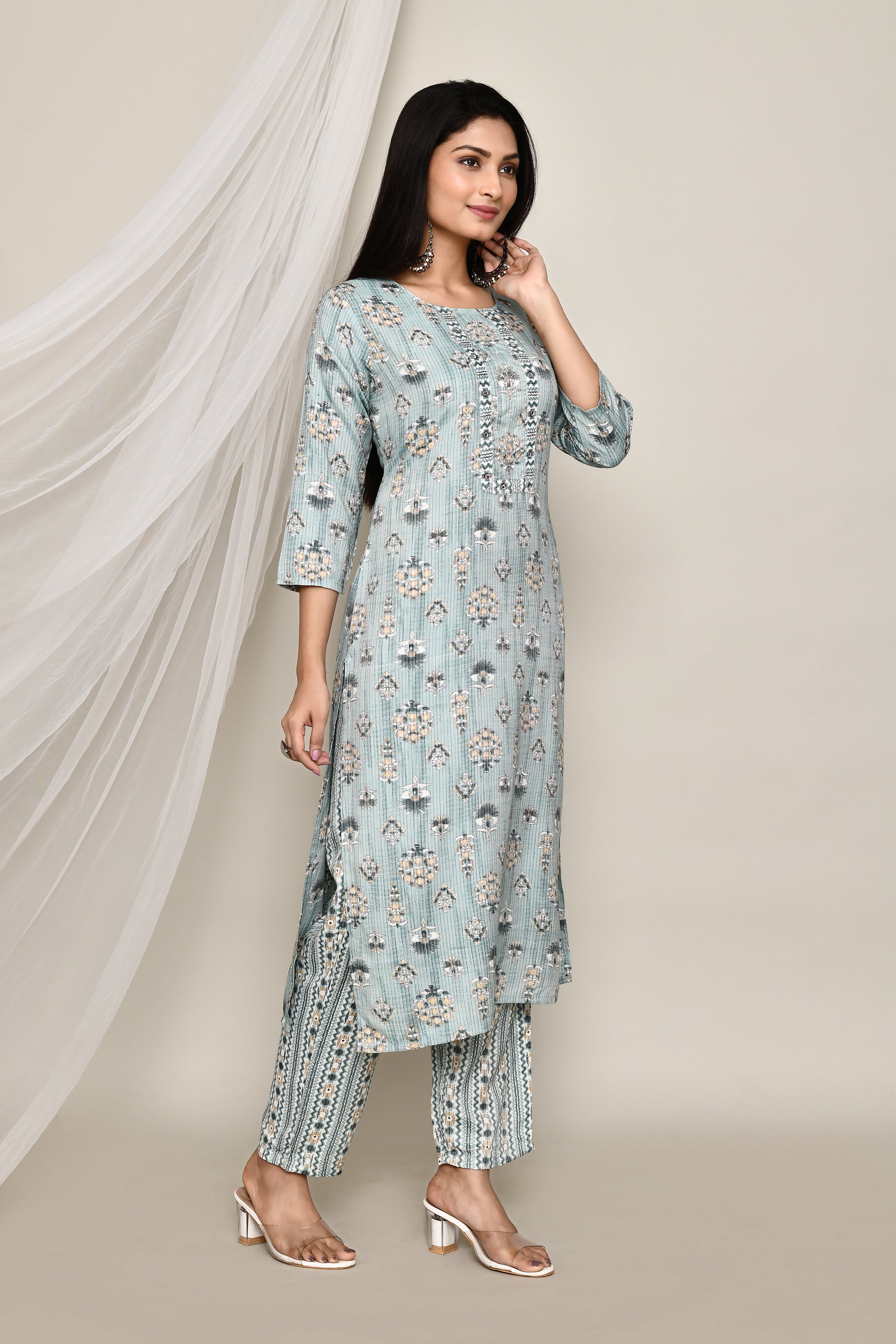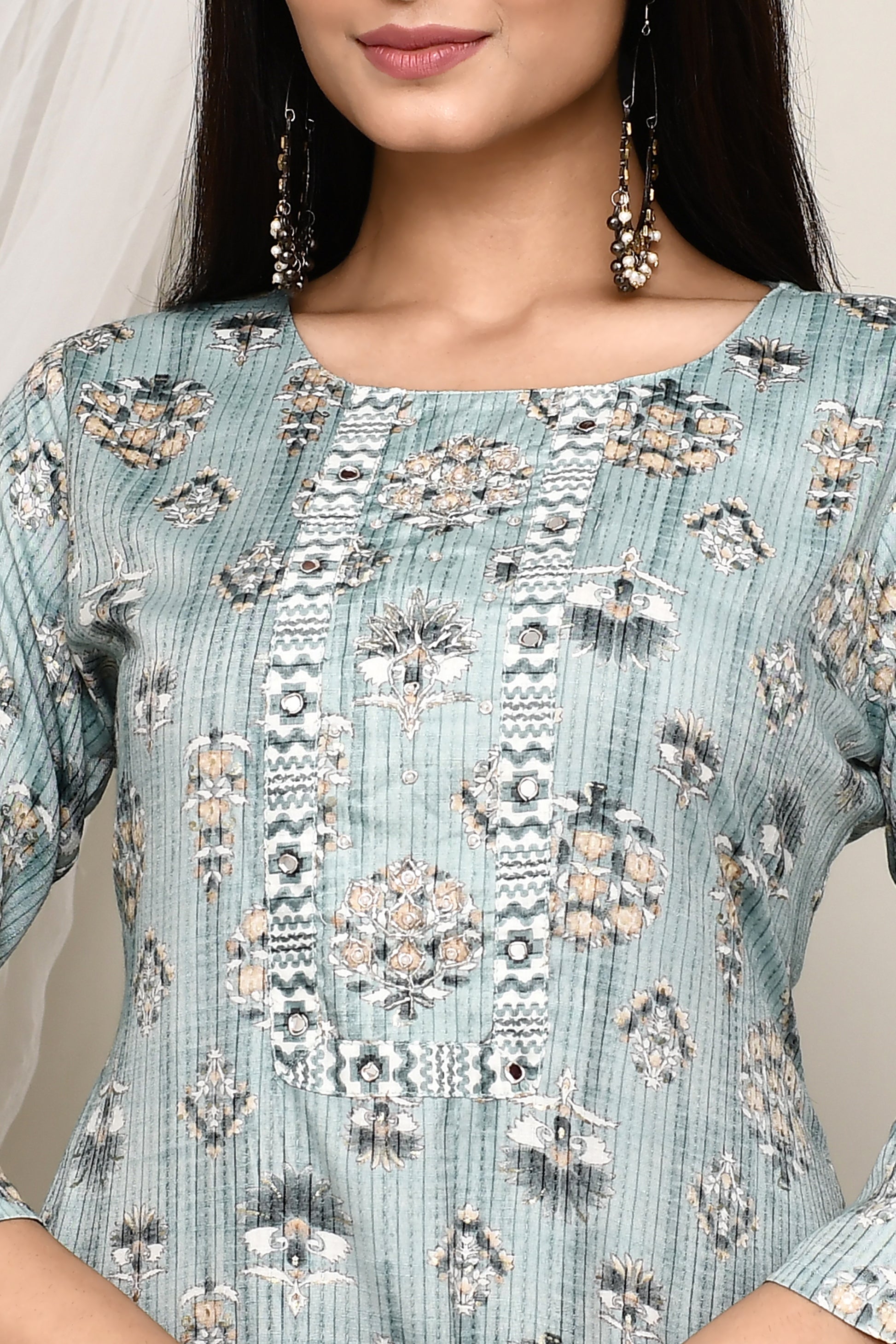 Mint Blue Self Line Stitch Printed 2 Pcs Kurti Set With Highlight