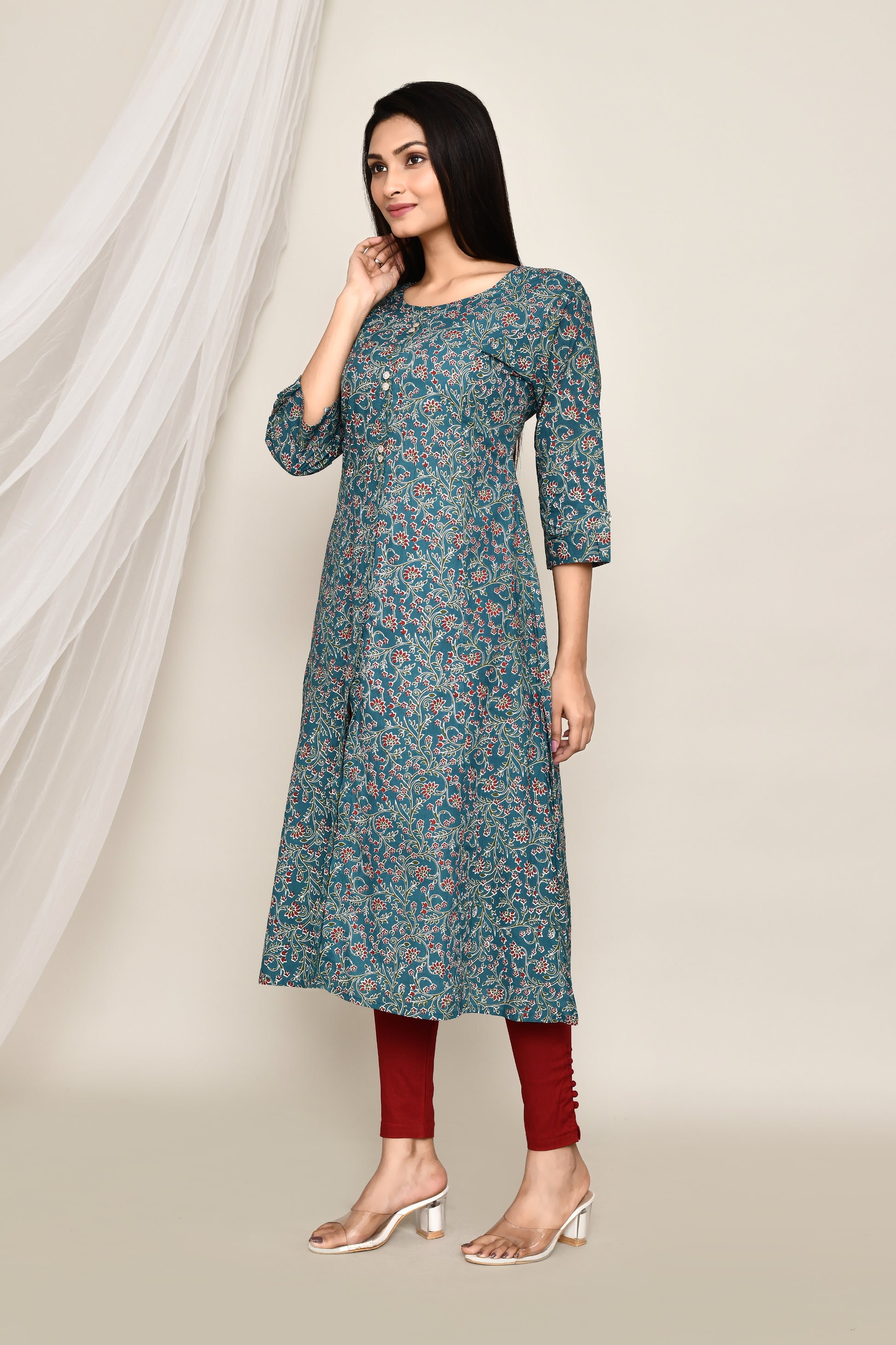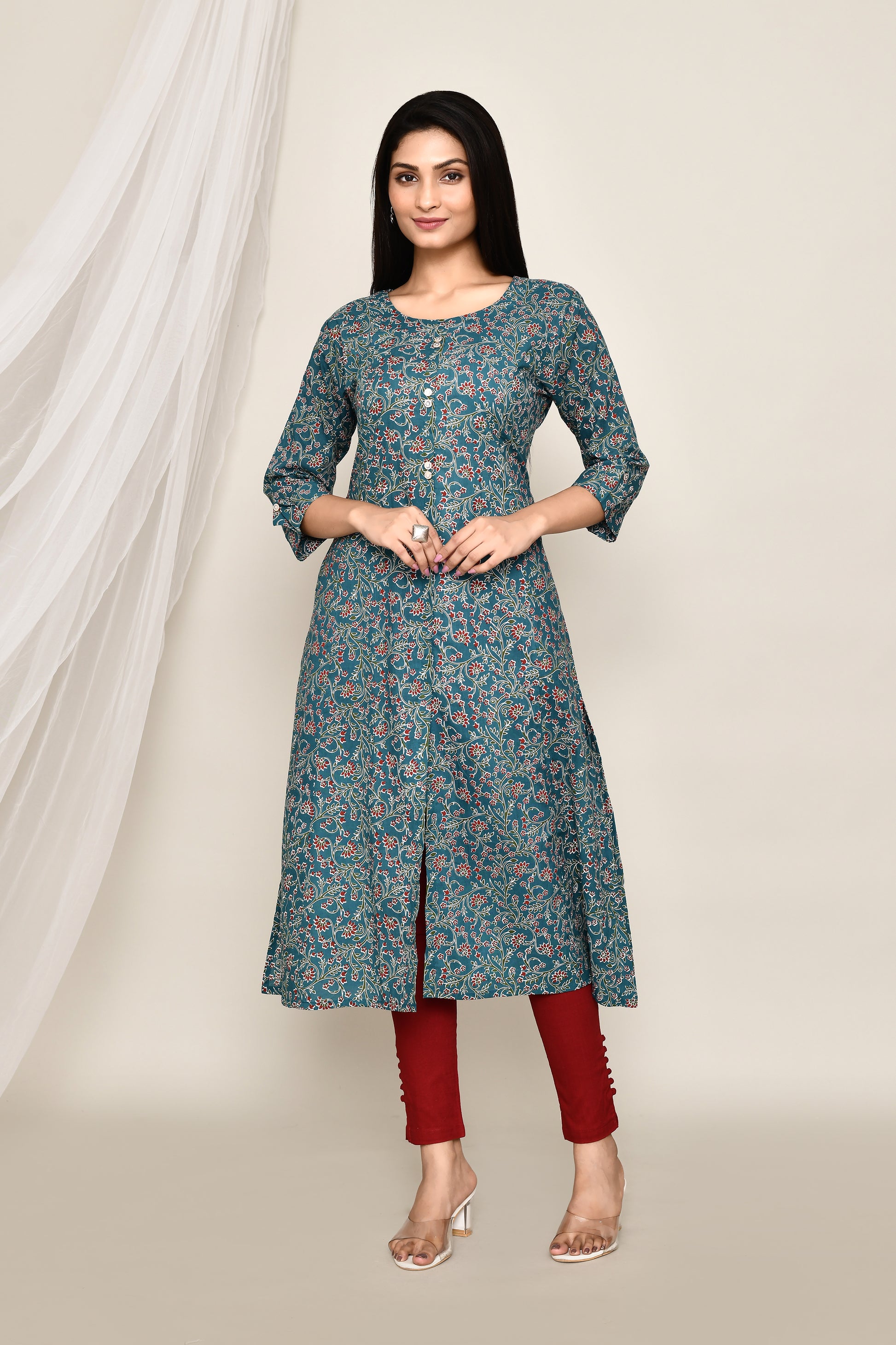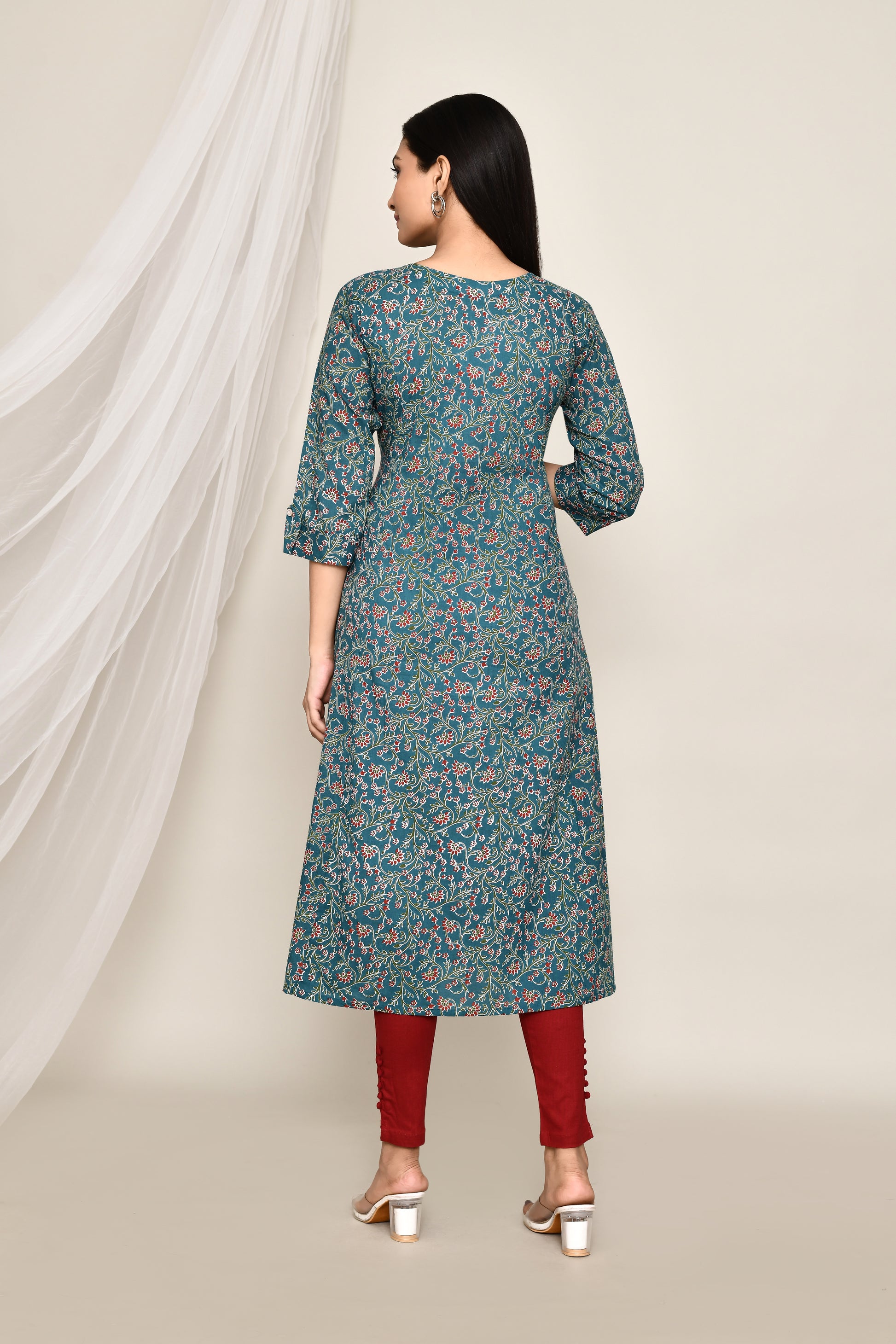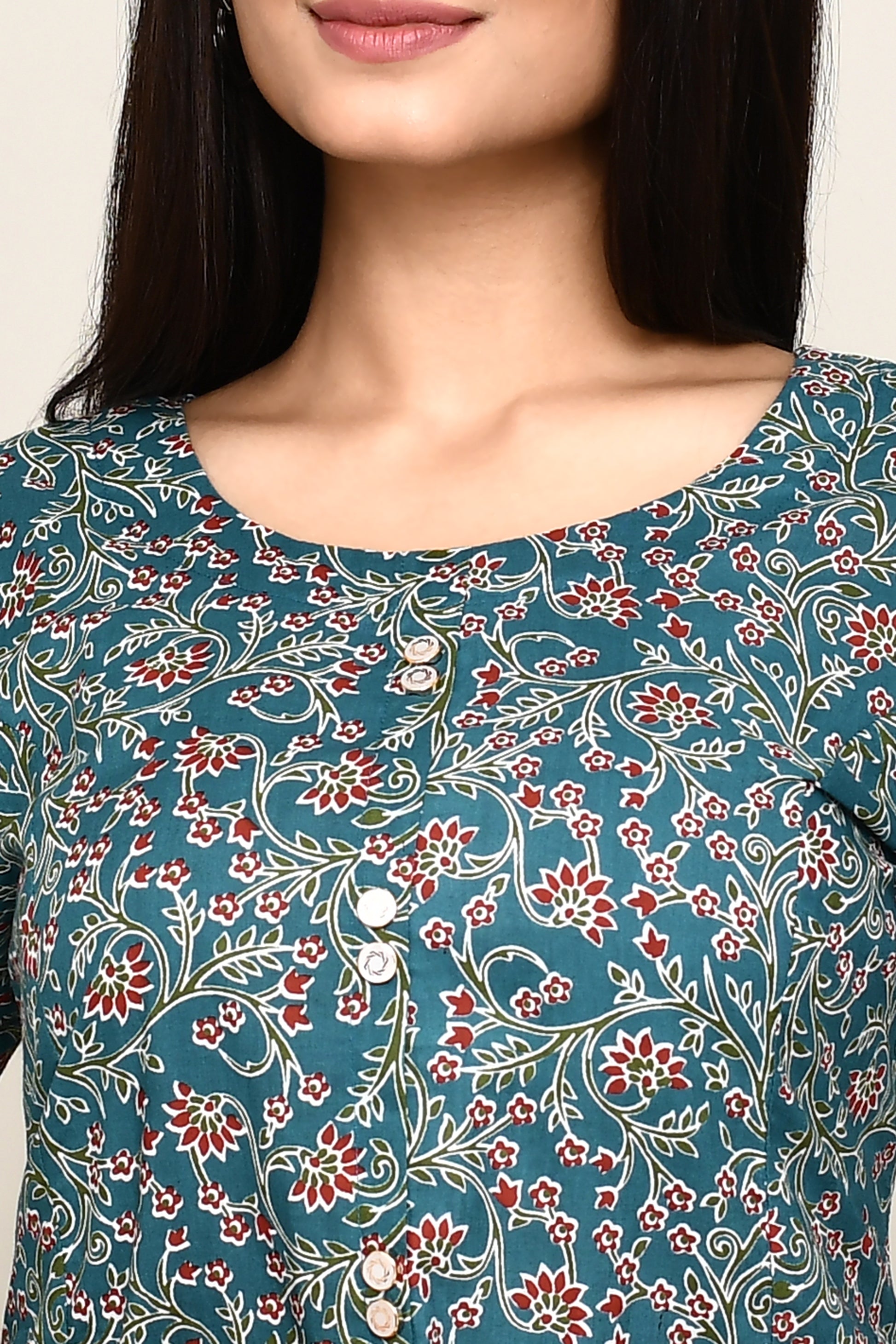 Teal Blue Floral A-Line Kurta