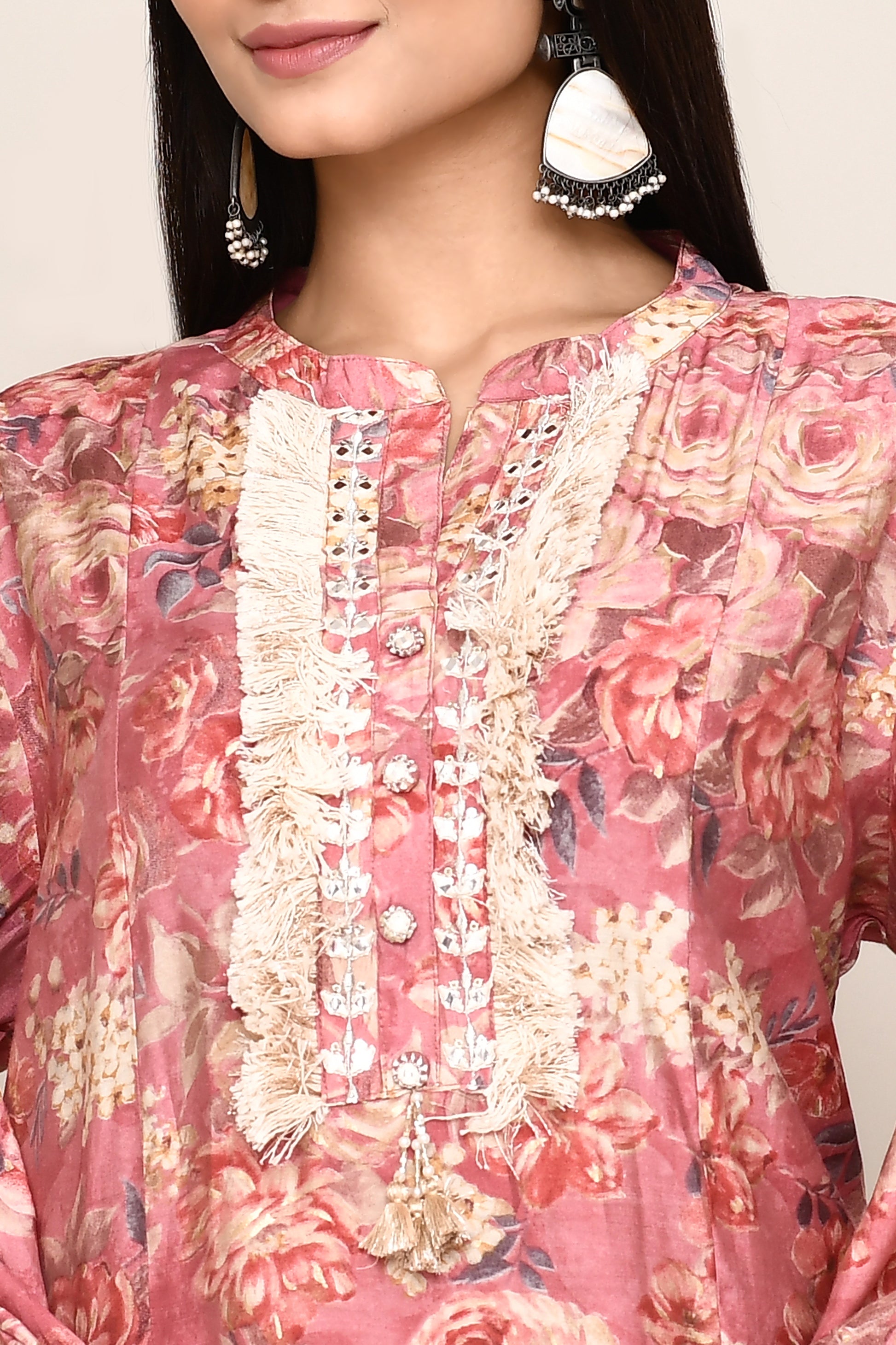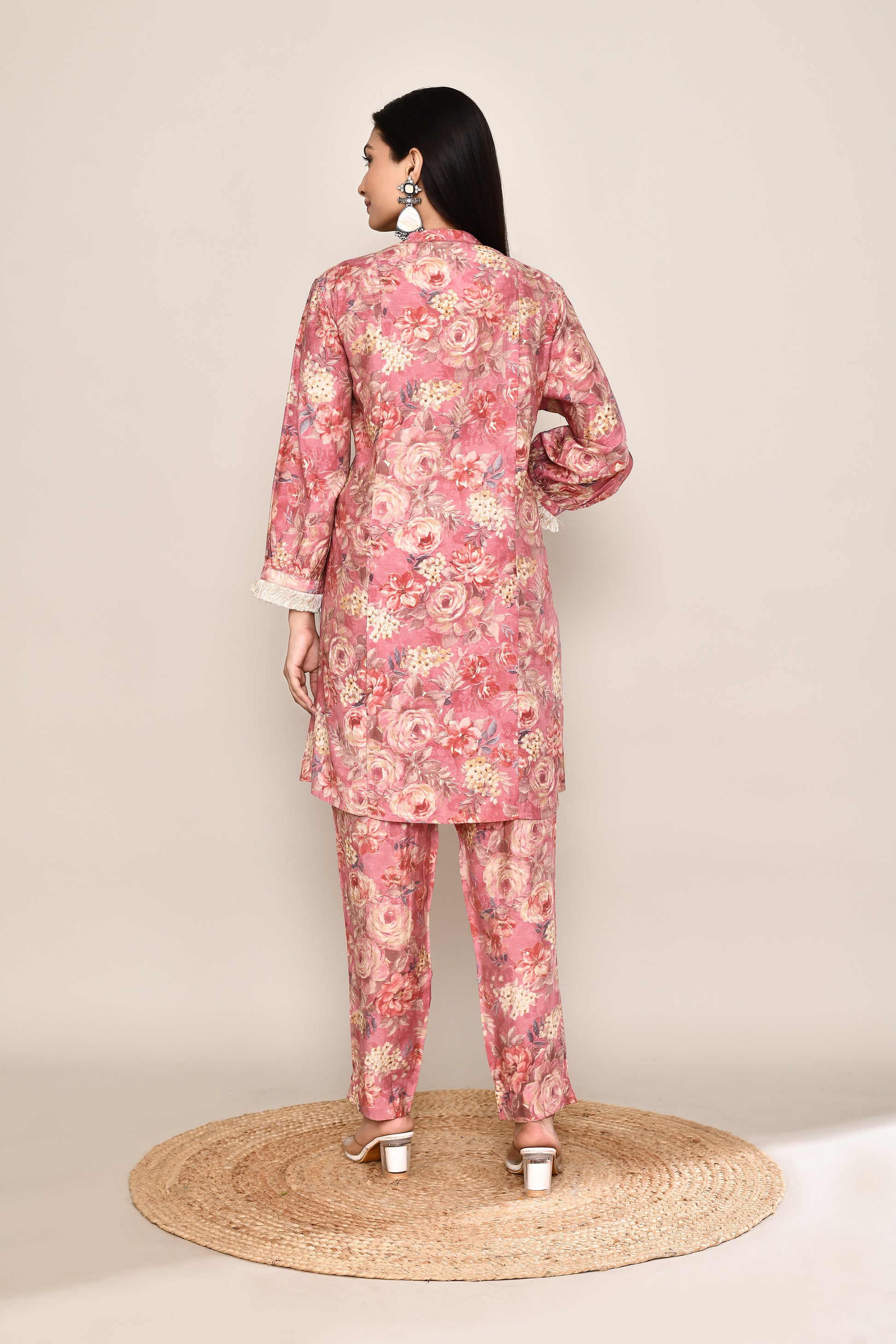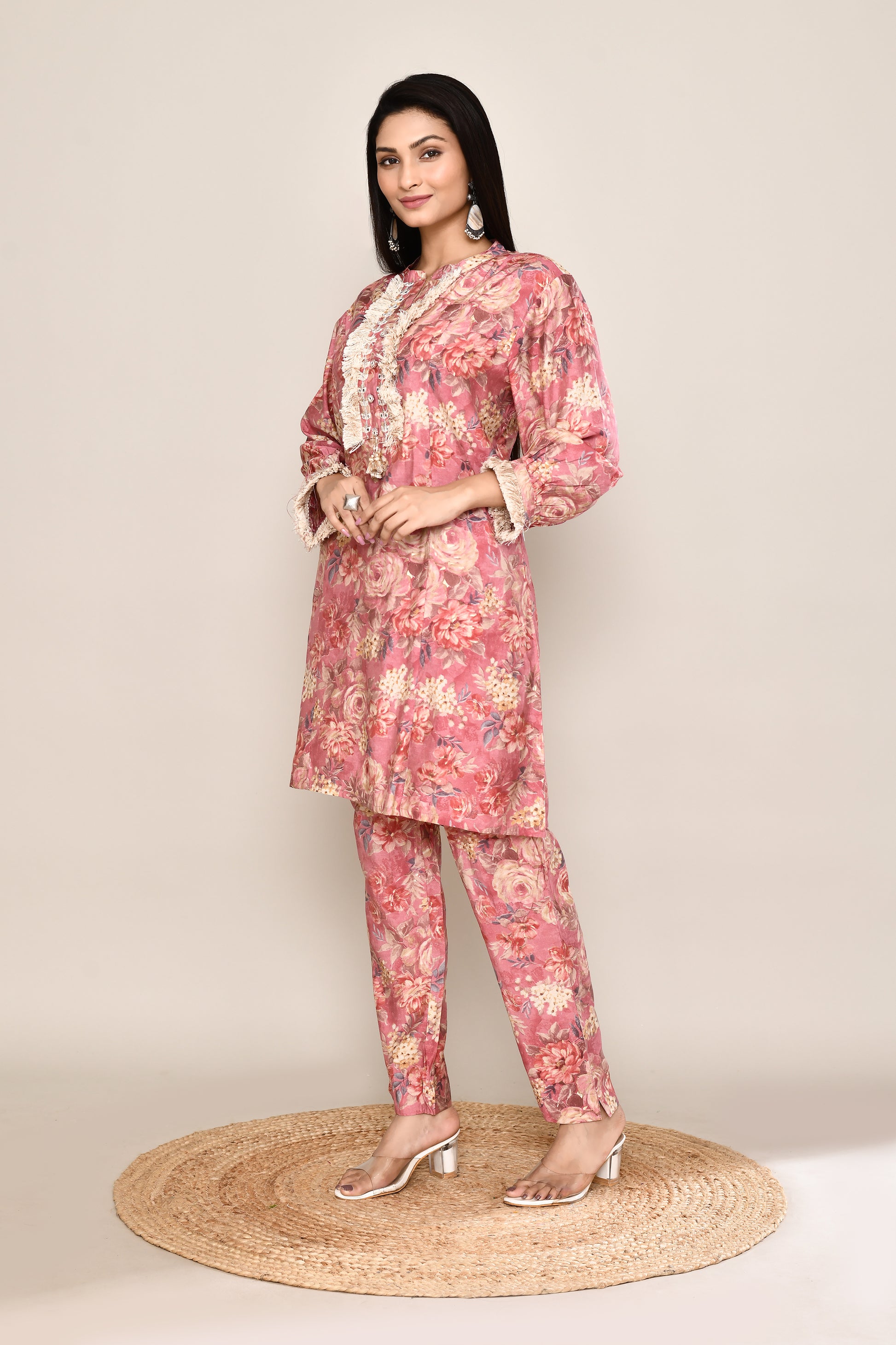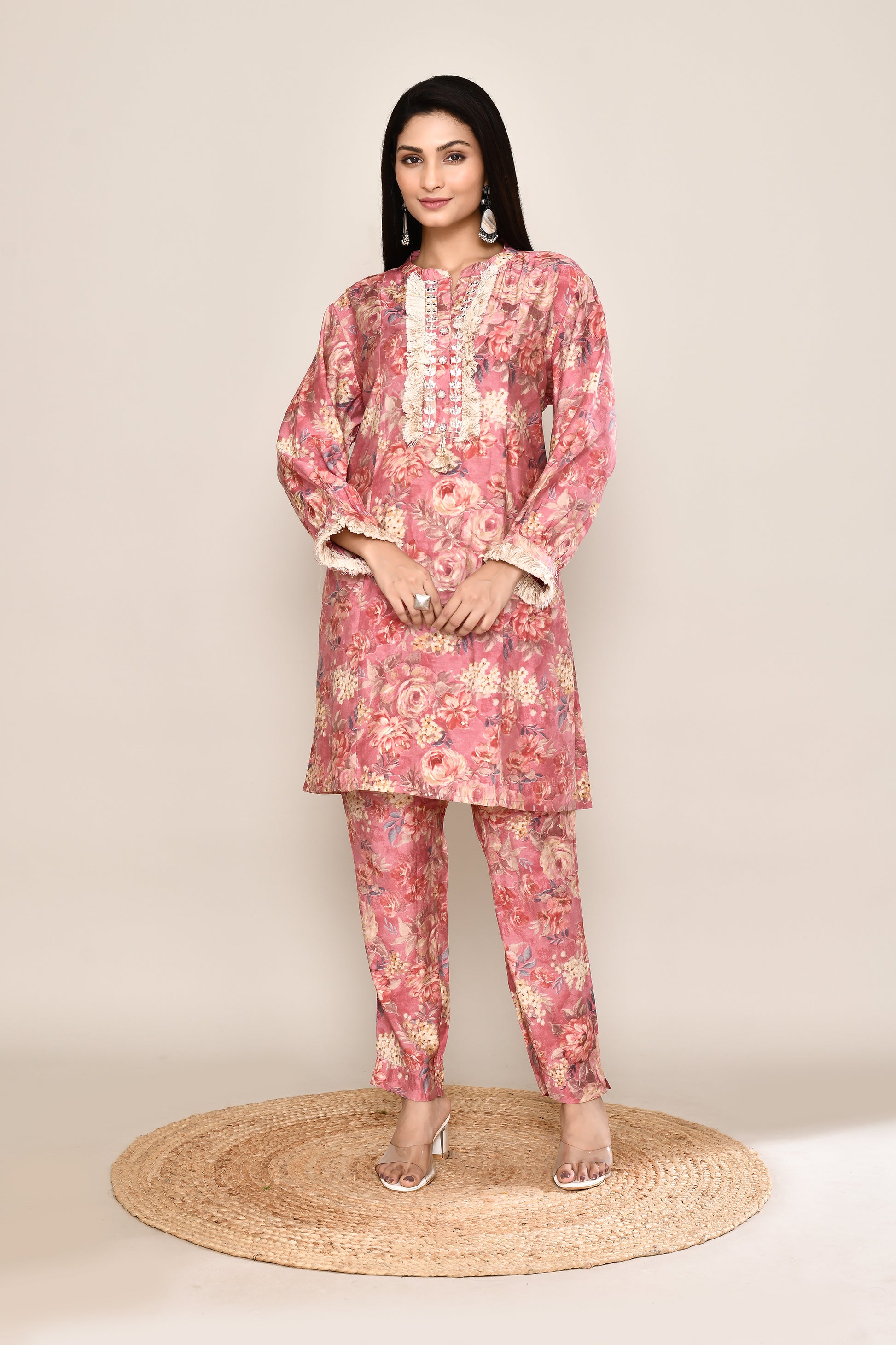 Floral Co-ord Set With Fringe Neckline And Sleeves