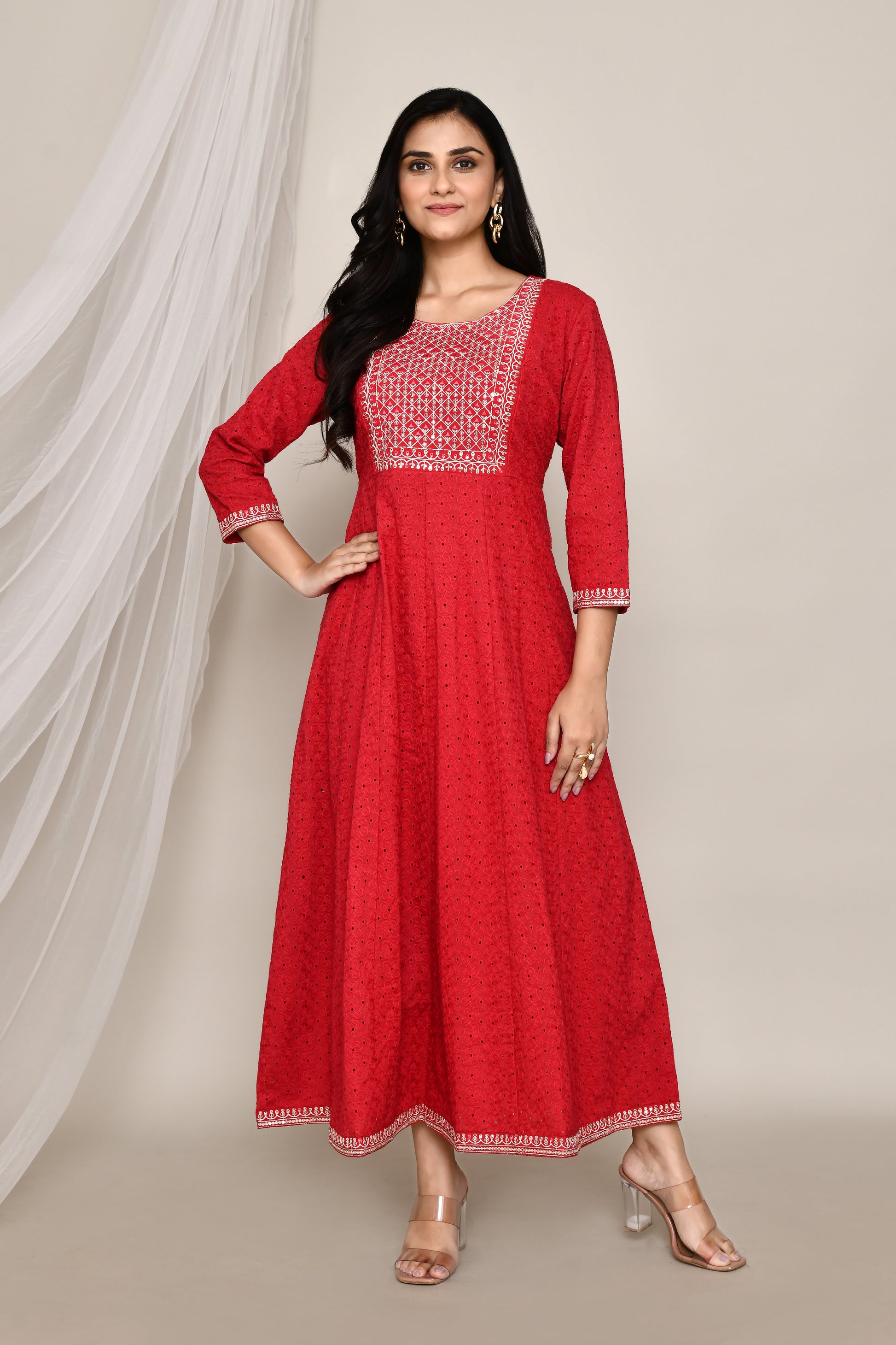Festive Red Hakoba Anarkali With Neck Embroidery