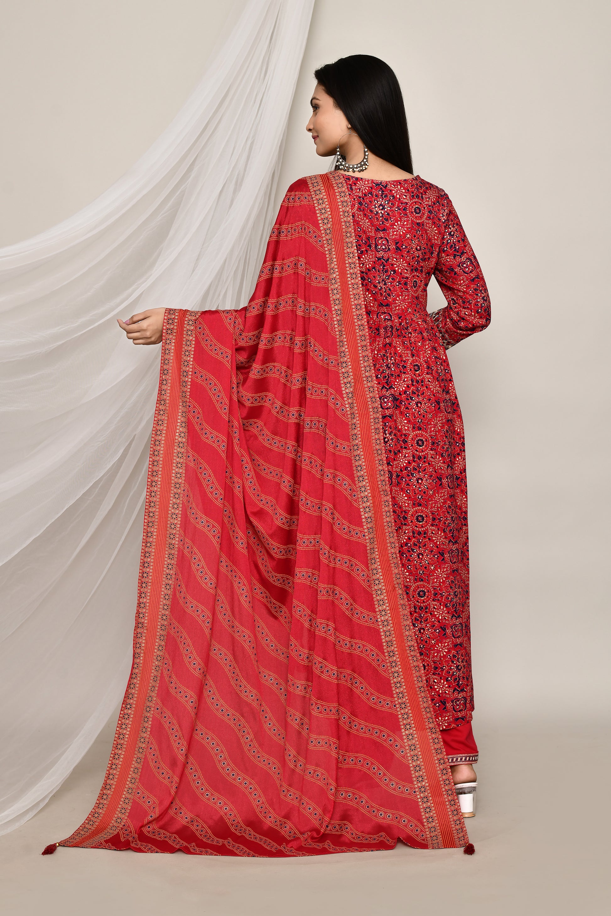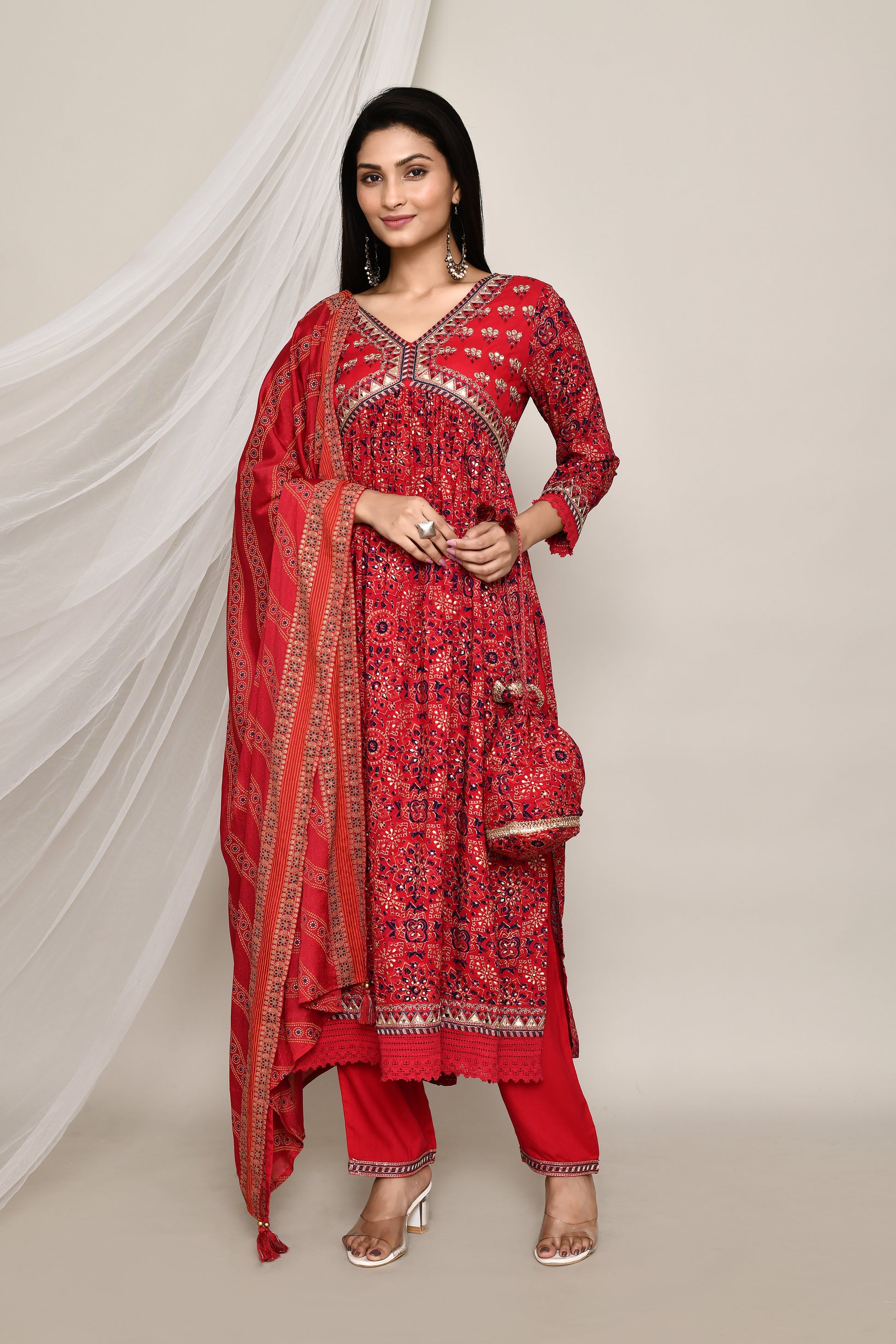 Festive Red Crimson Anarkali With Neck Embroidery And Potli 4PC