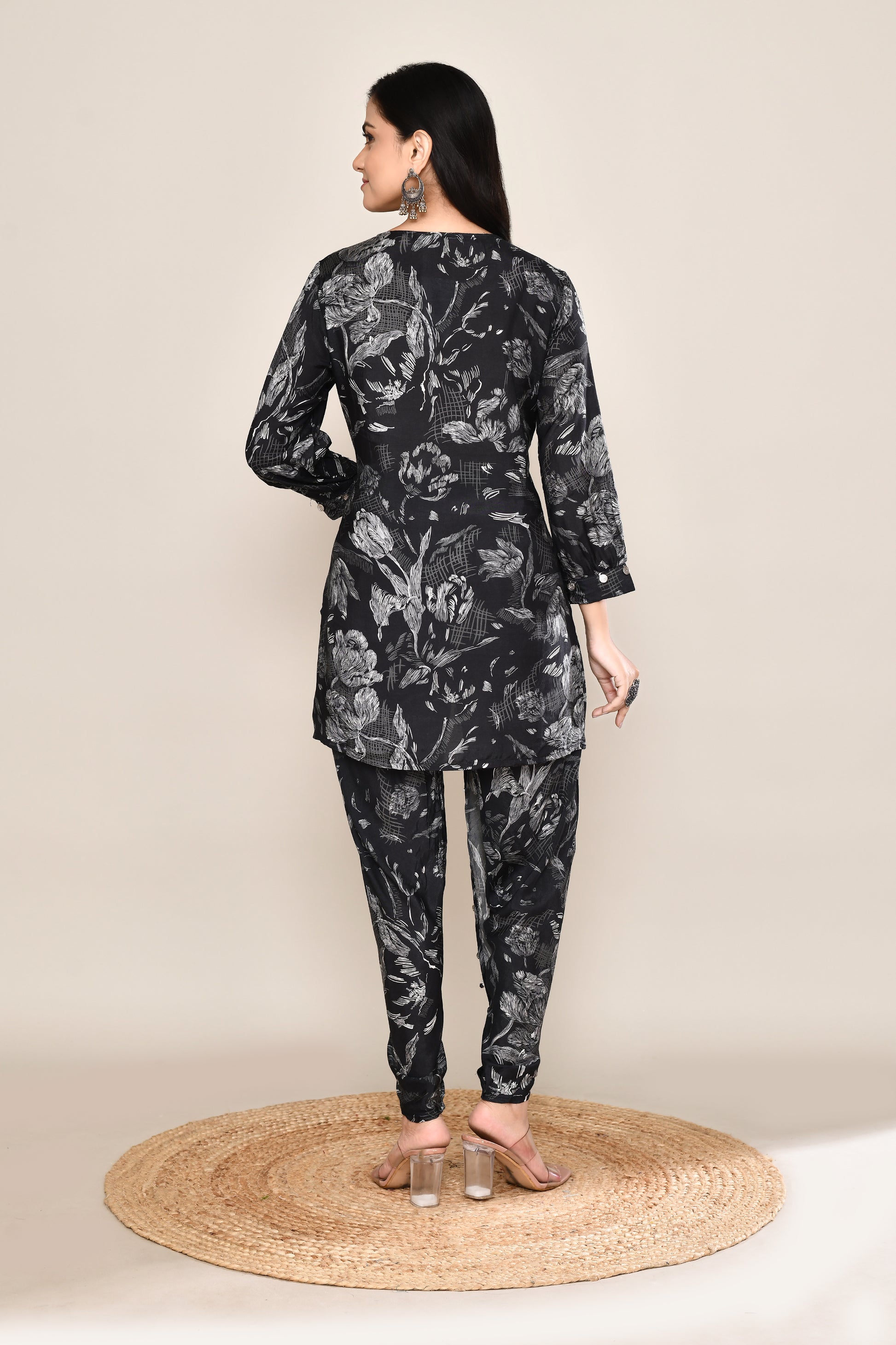 Grey Printed Co-ord Set With Tulip Pants And Added Coin Tassels