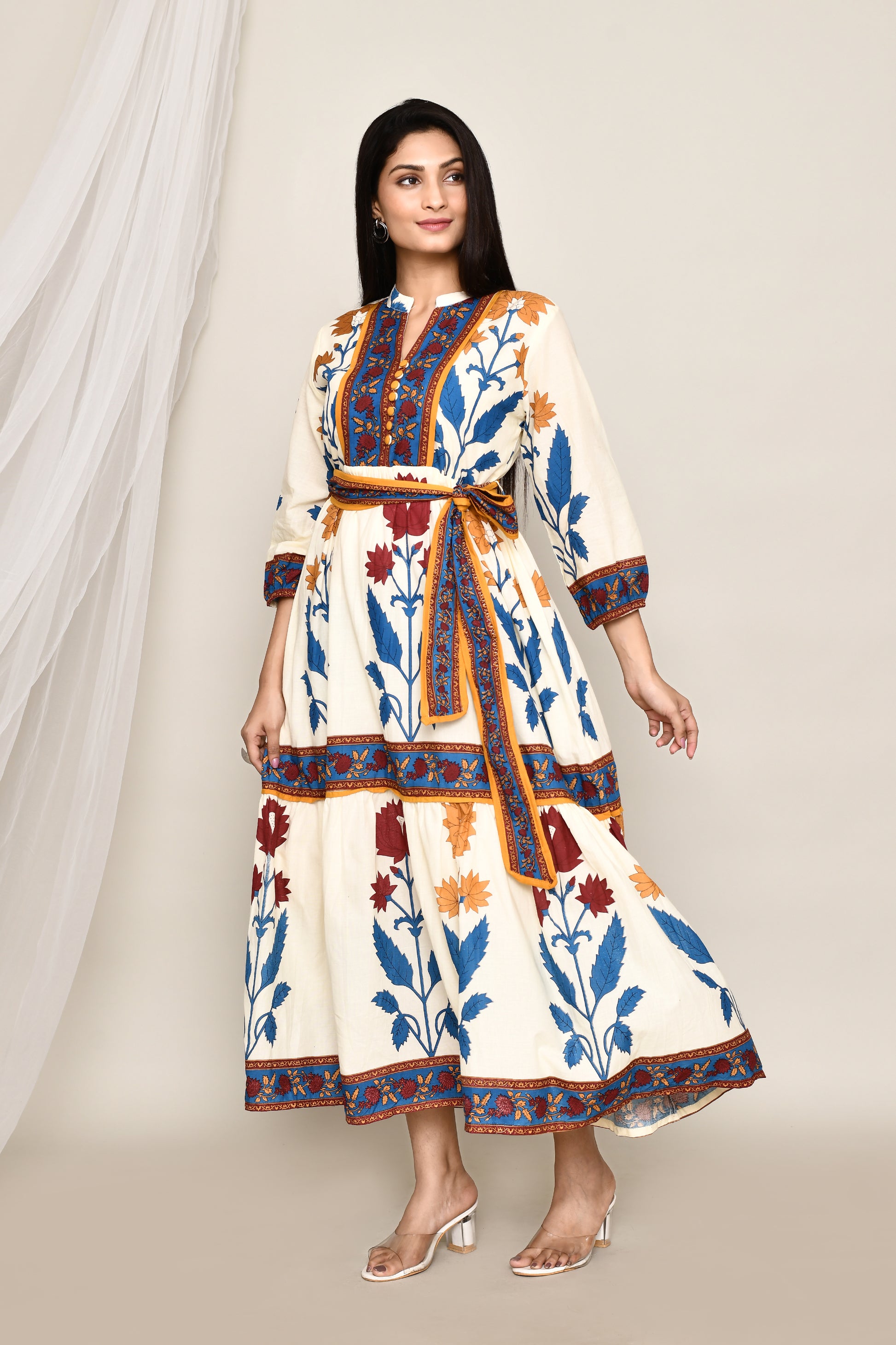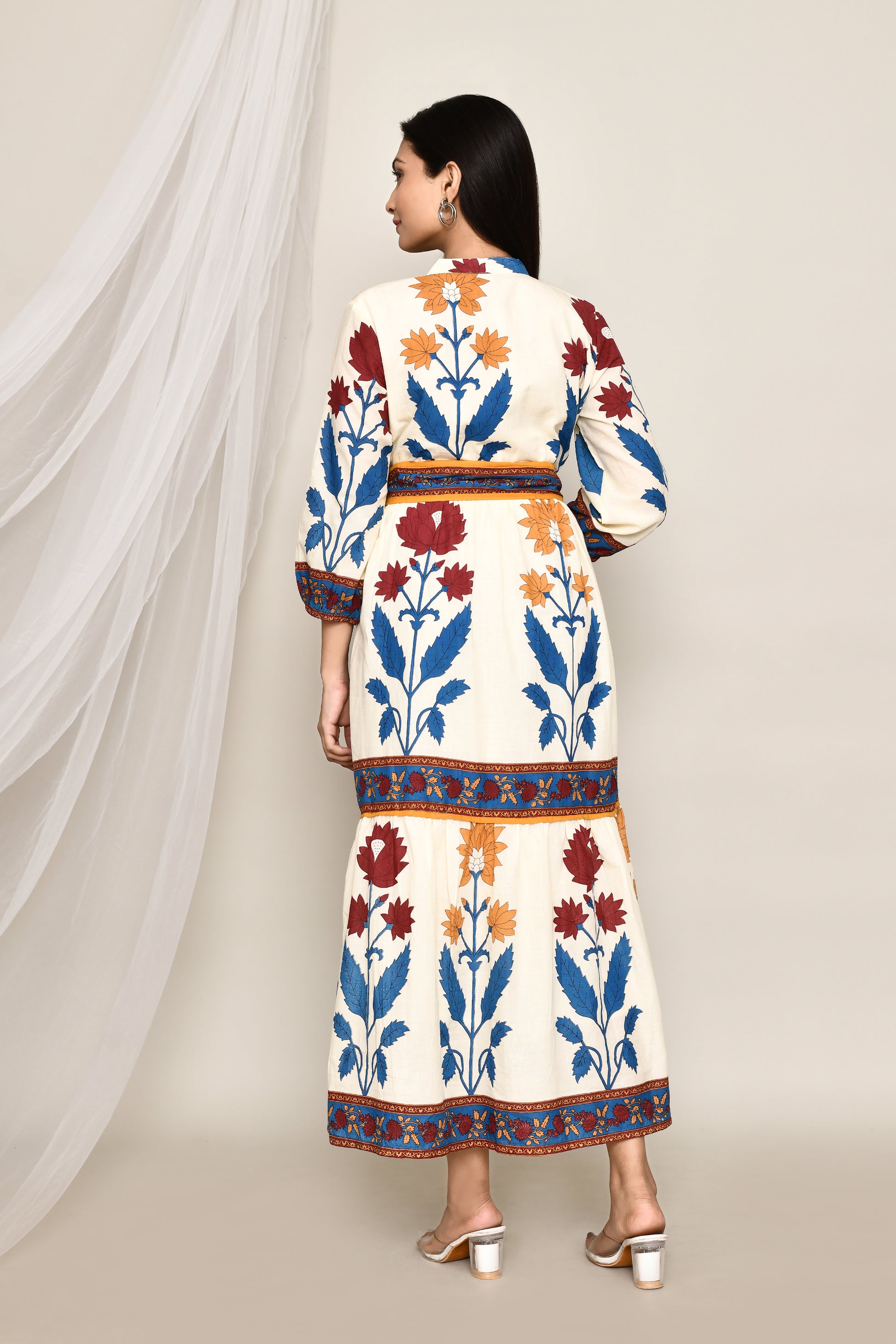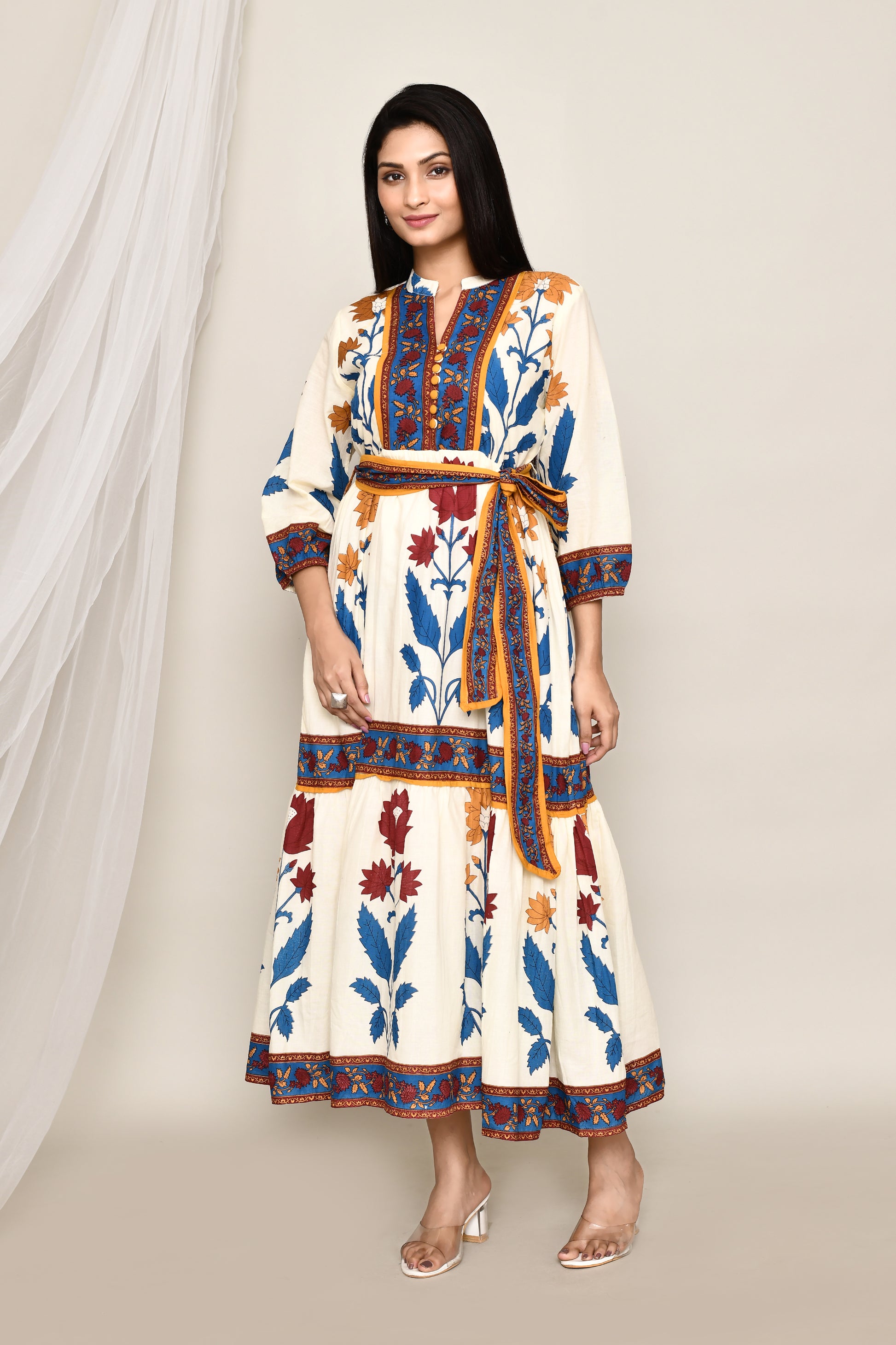 Off White Multi Printed Floral Flowy Midi Dress With Belt