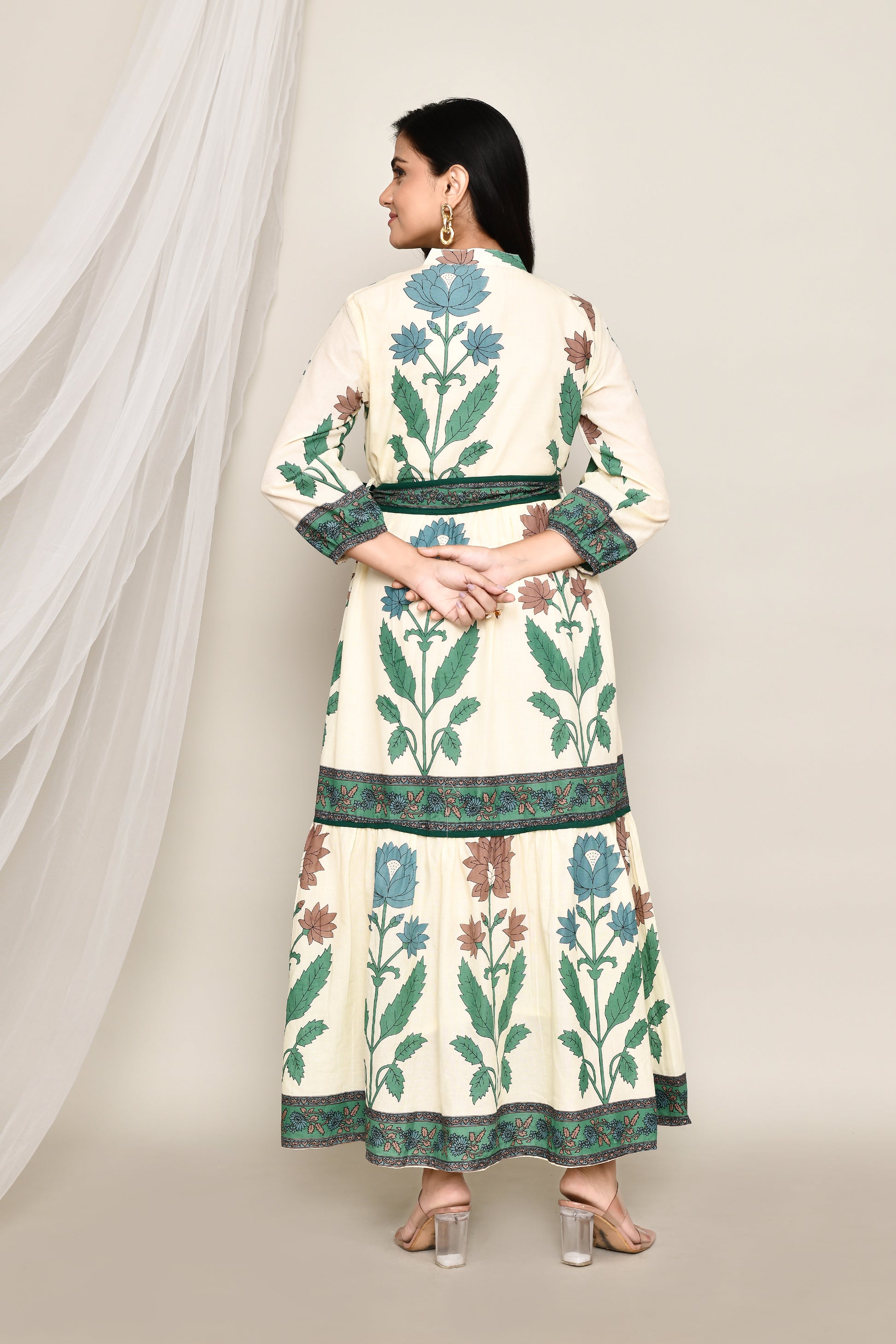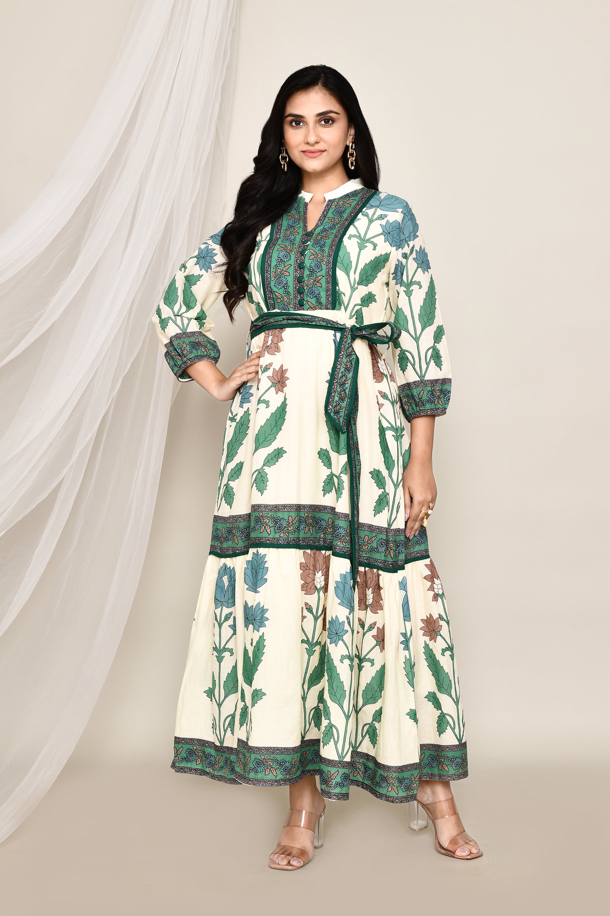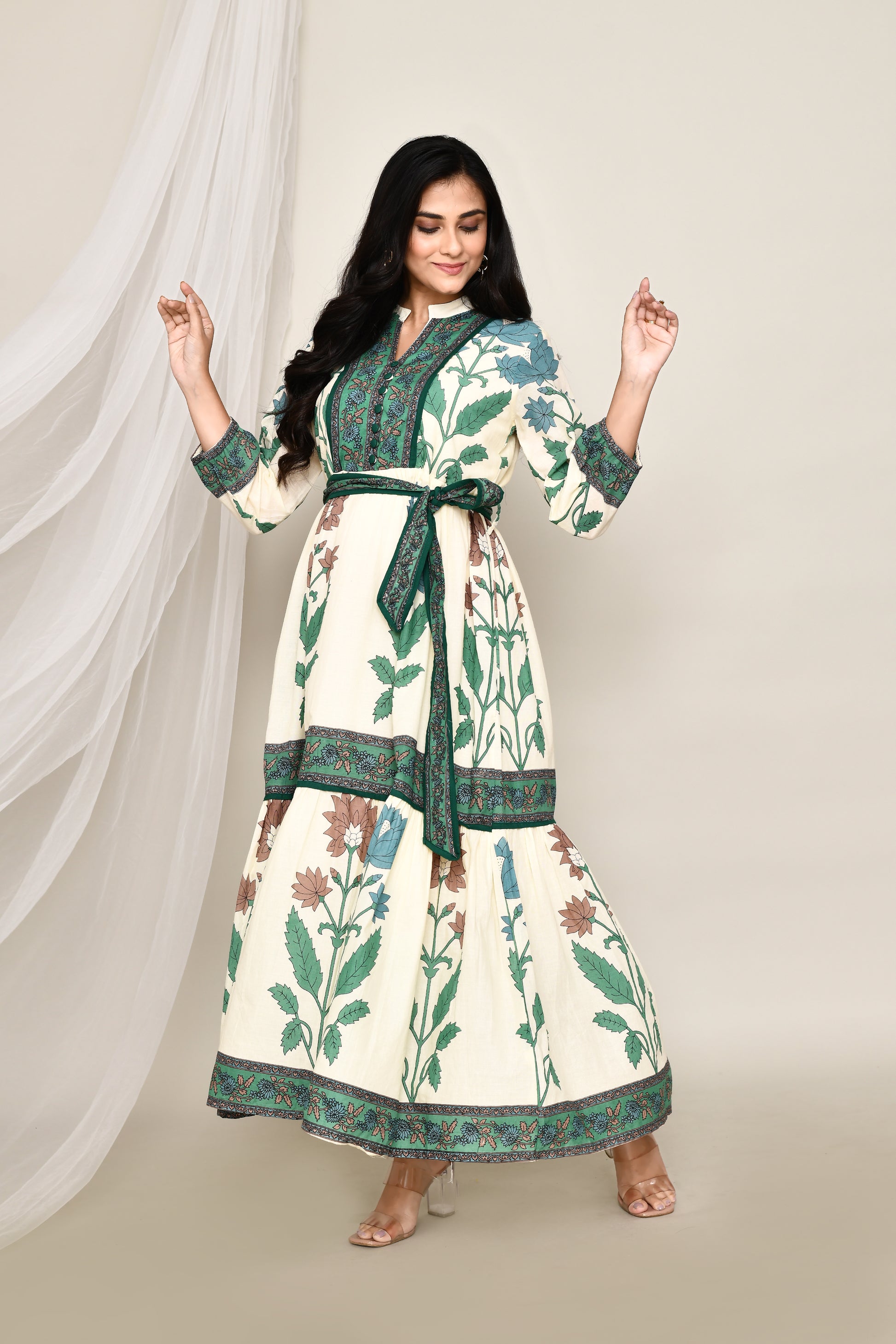 Off White Multi Printed Floral Flowy Midi Dress With Belt