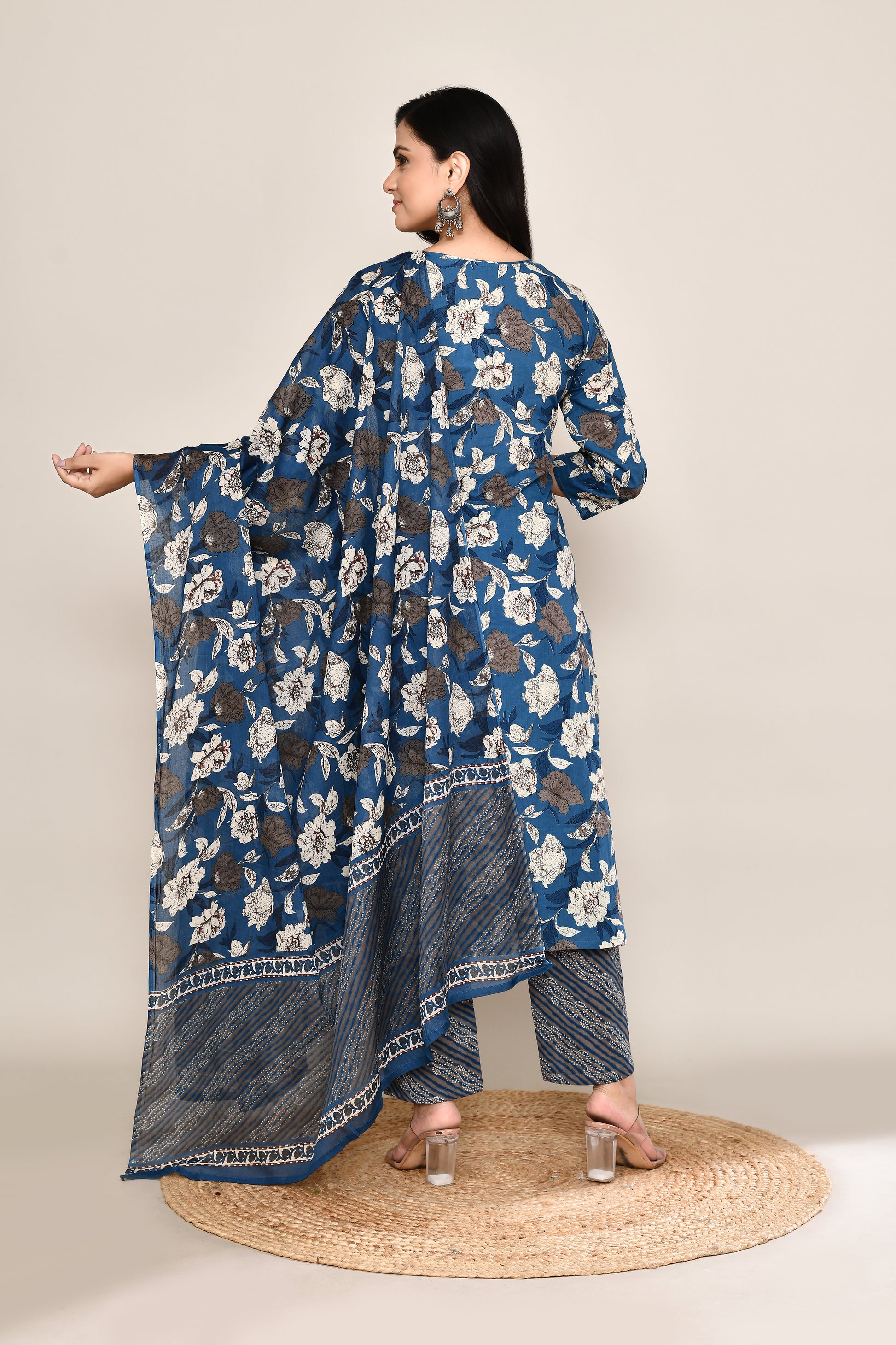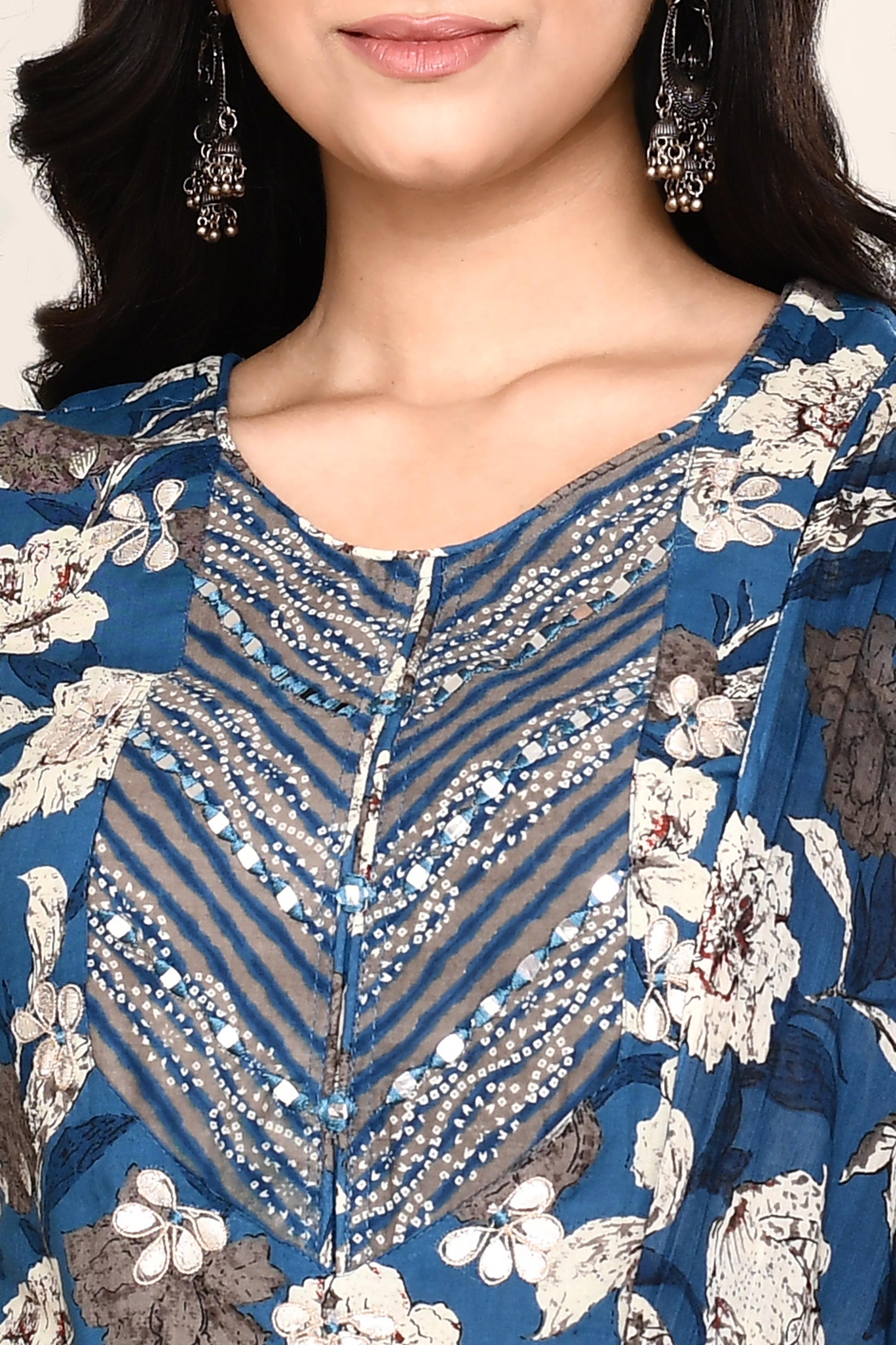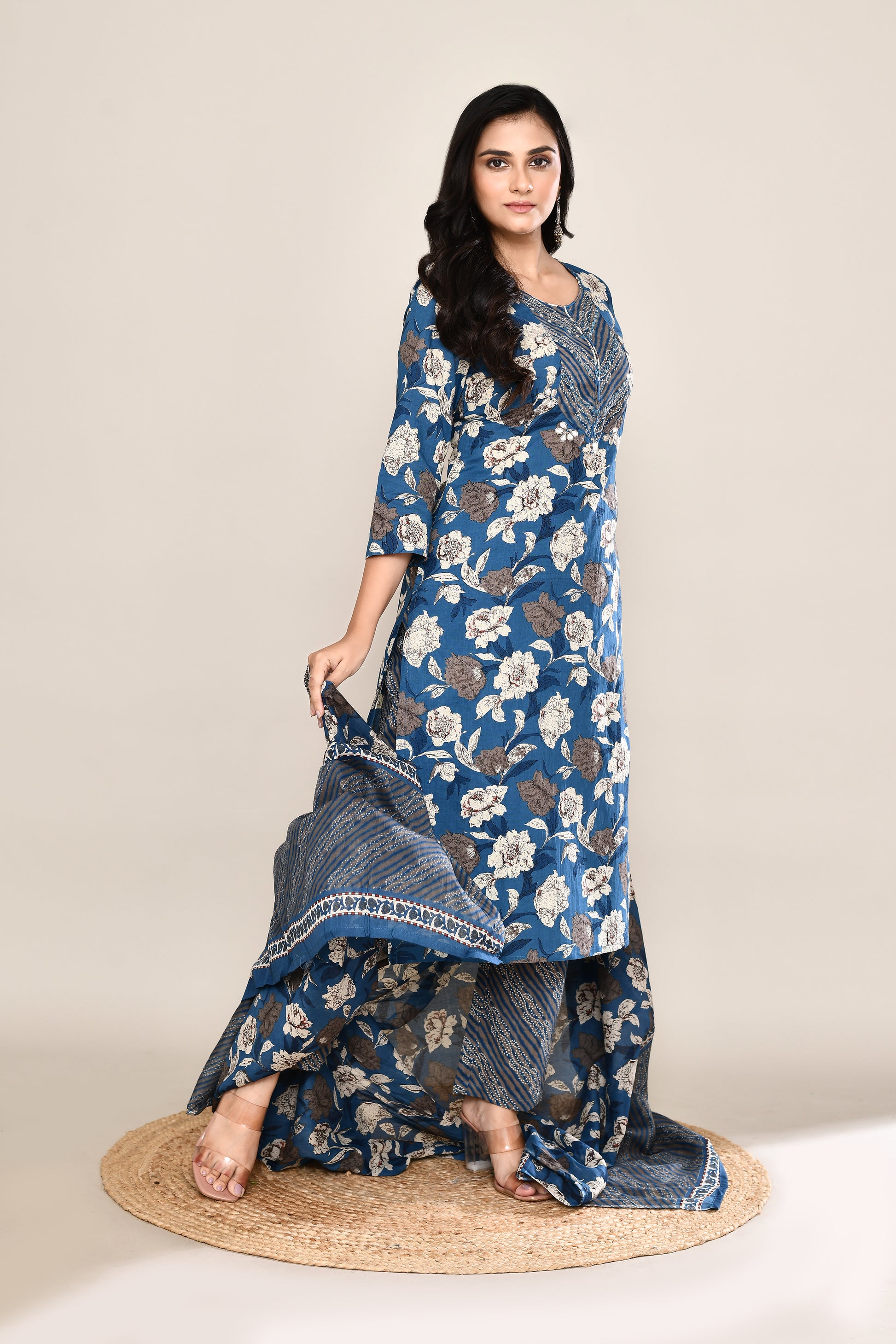 Turquoise Big Floral 3 Pcs Kurta Set With Neckline Embroidery