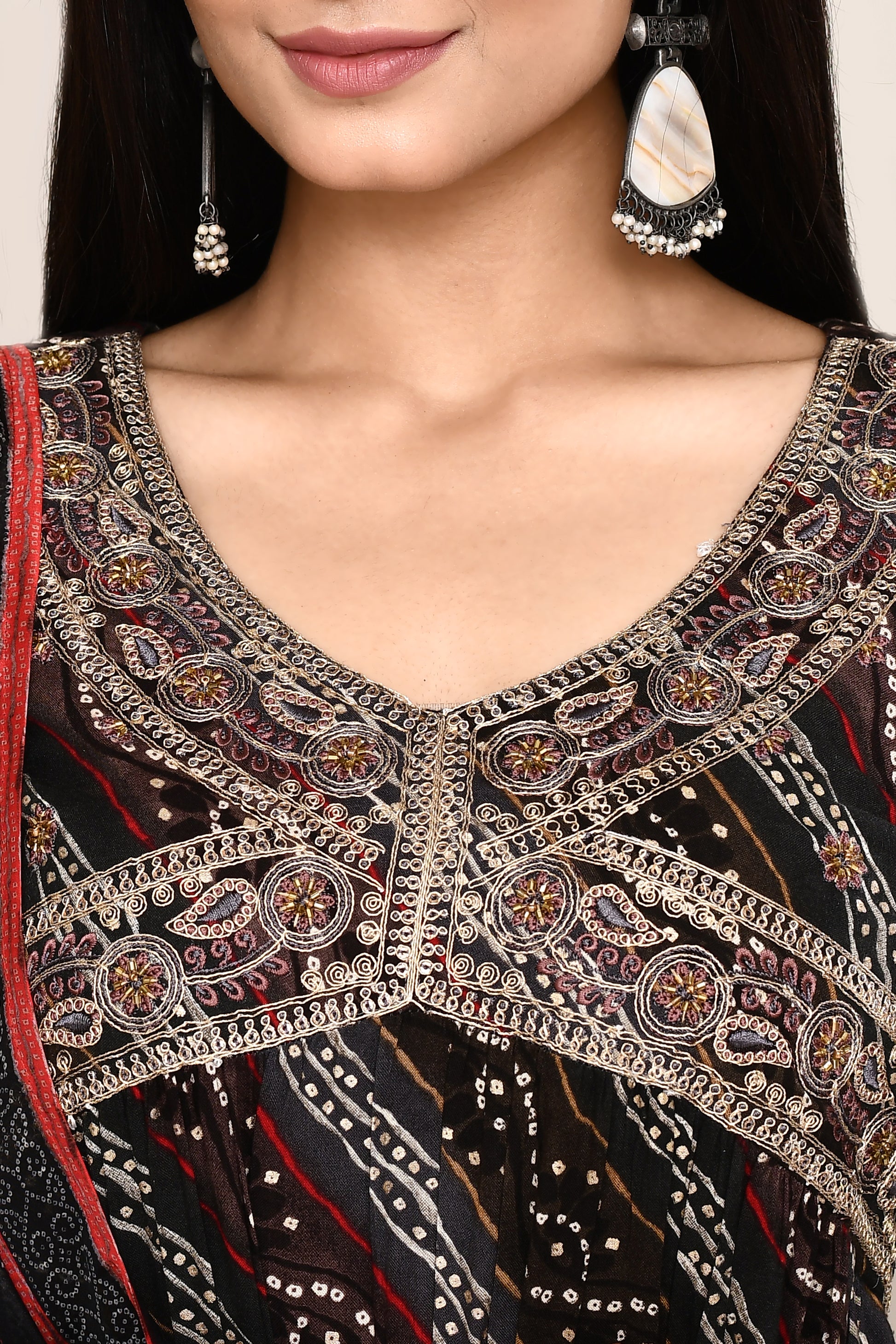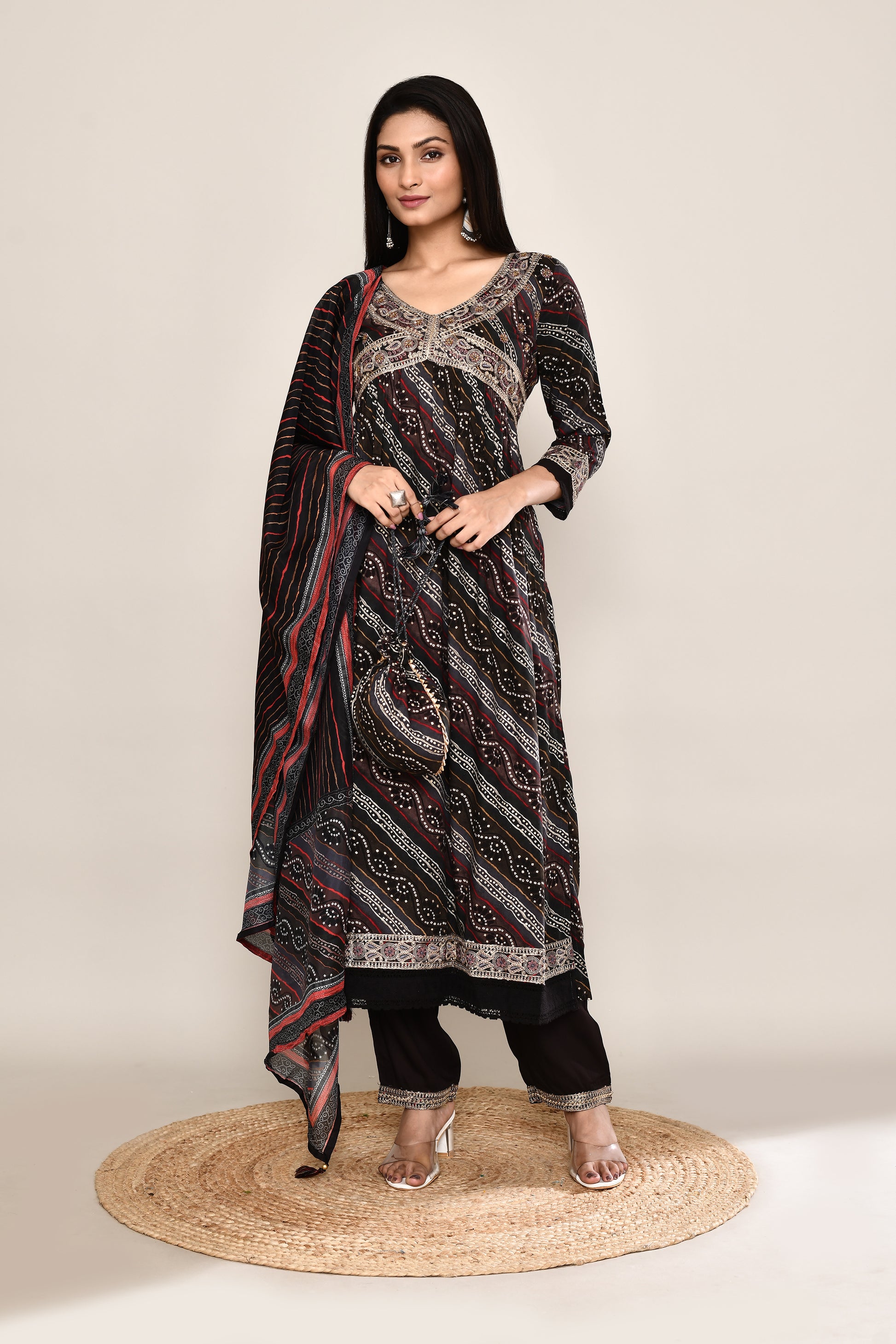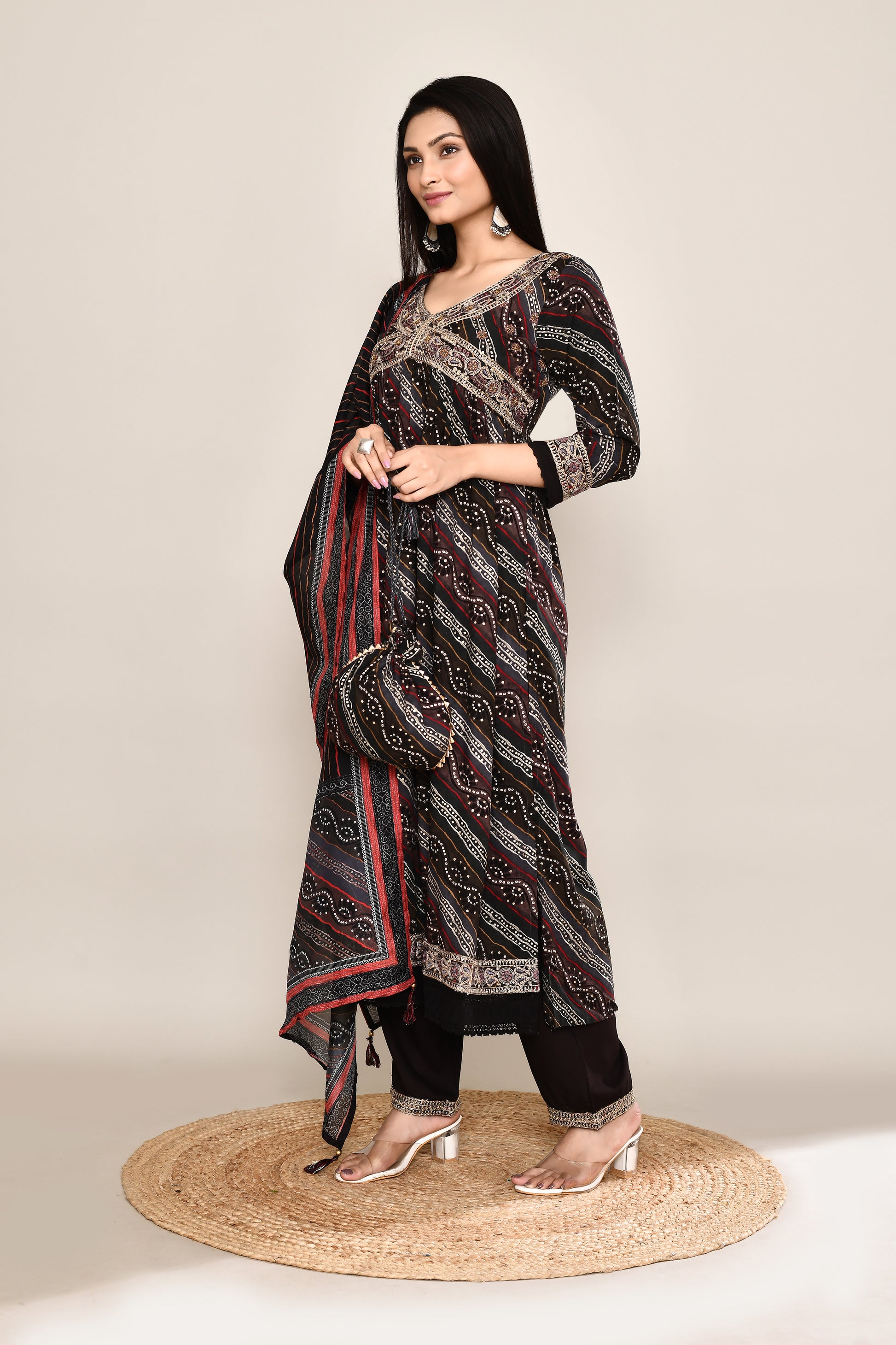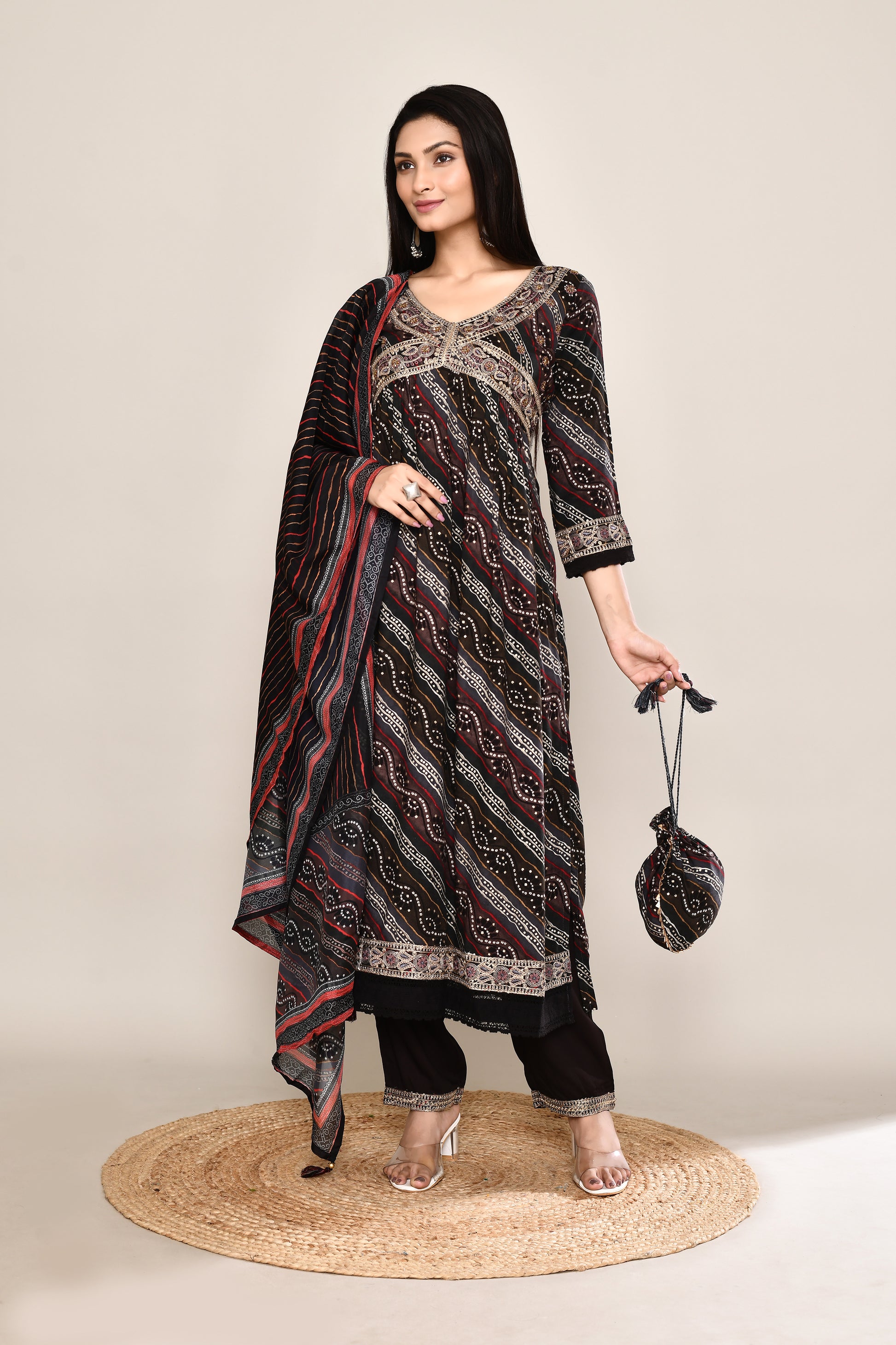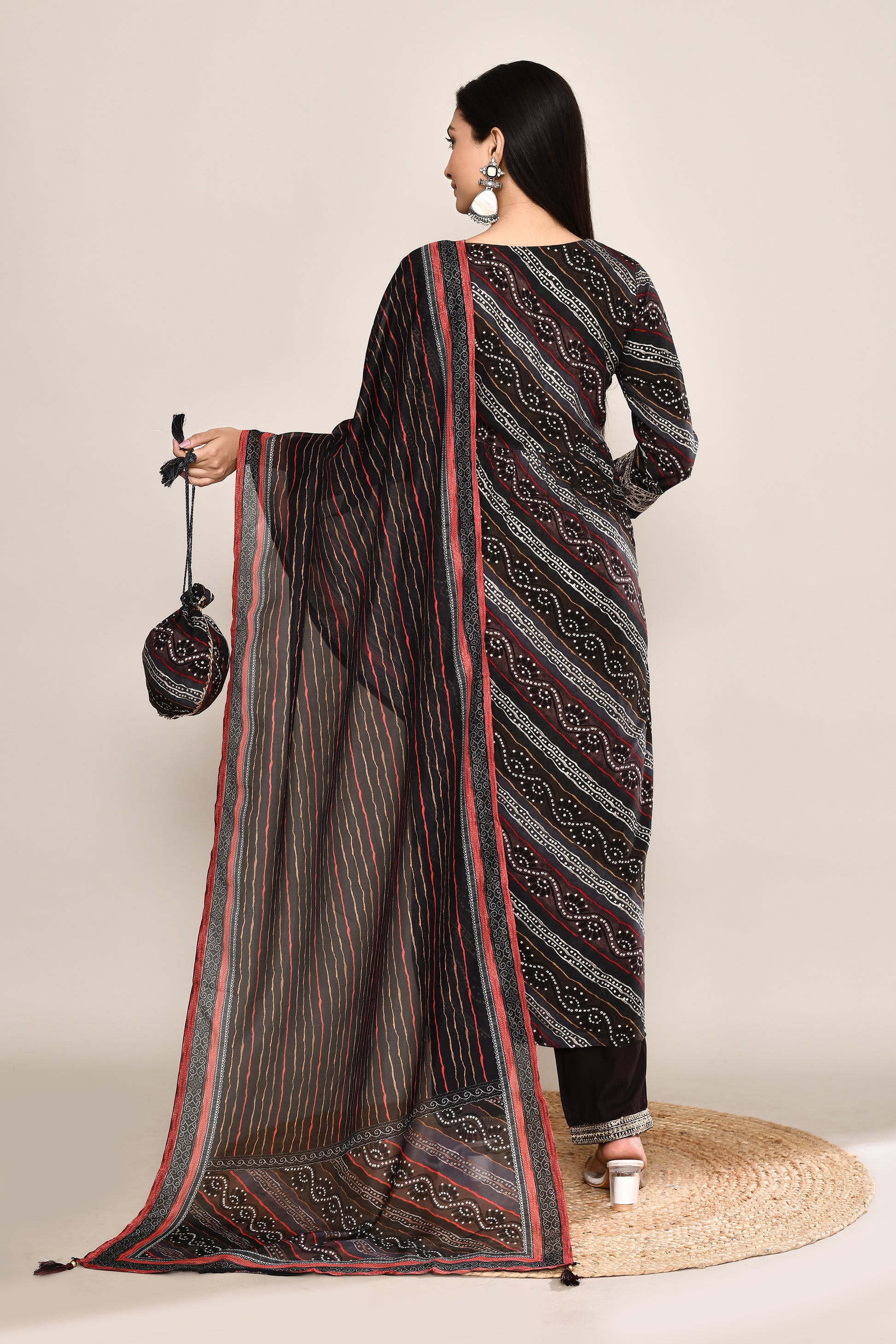 Festive Bandhani Leheriya Mix Printed Black 4Pcs Suit Set With Embroidery And Potli