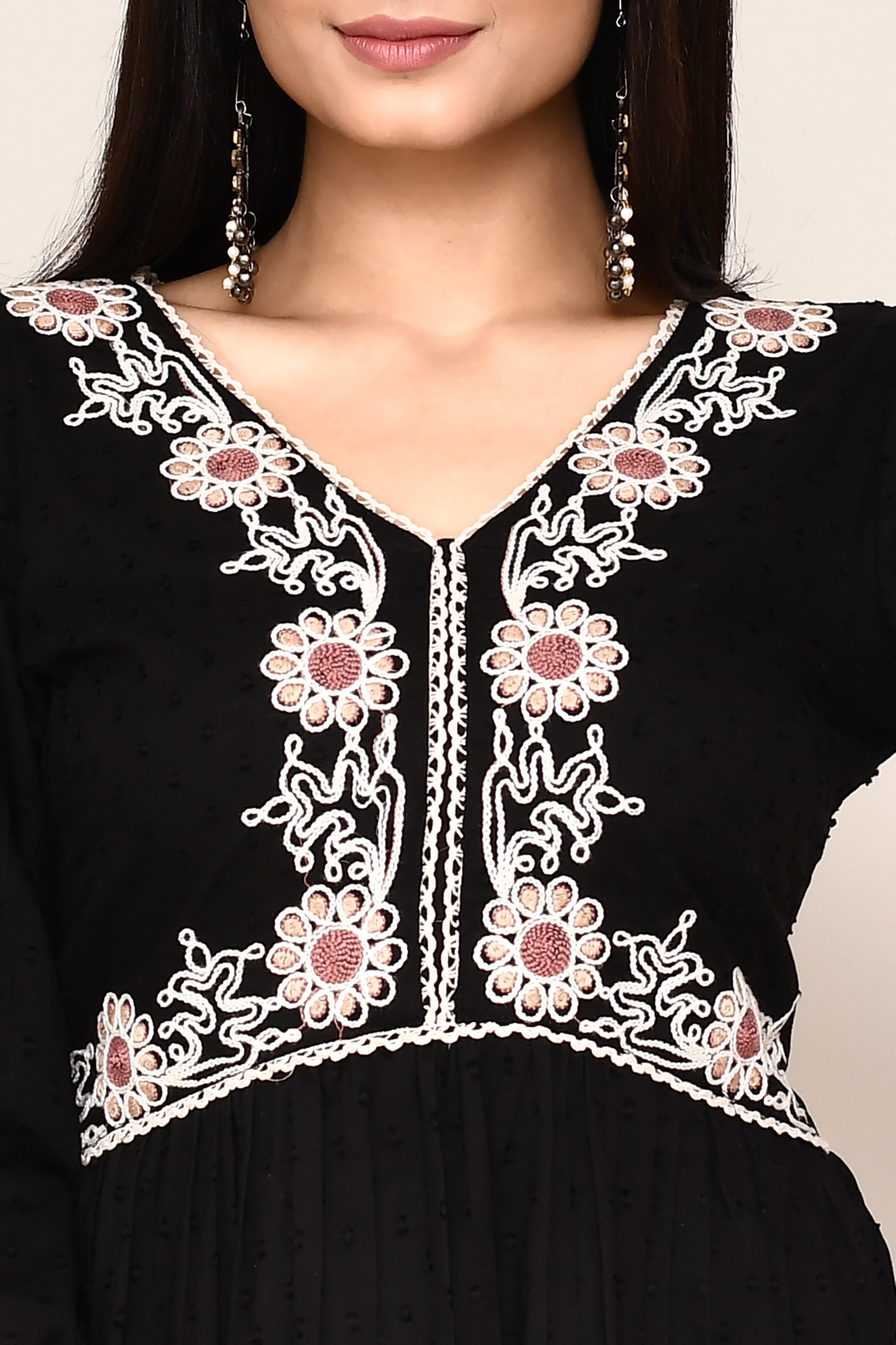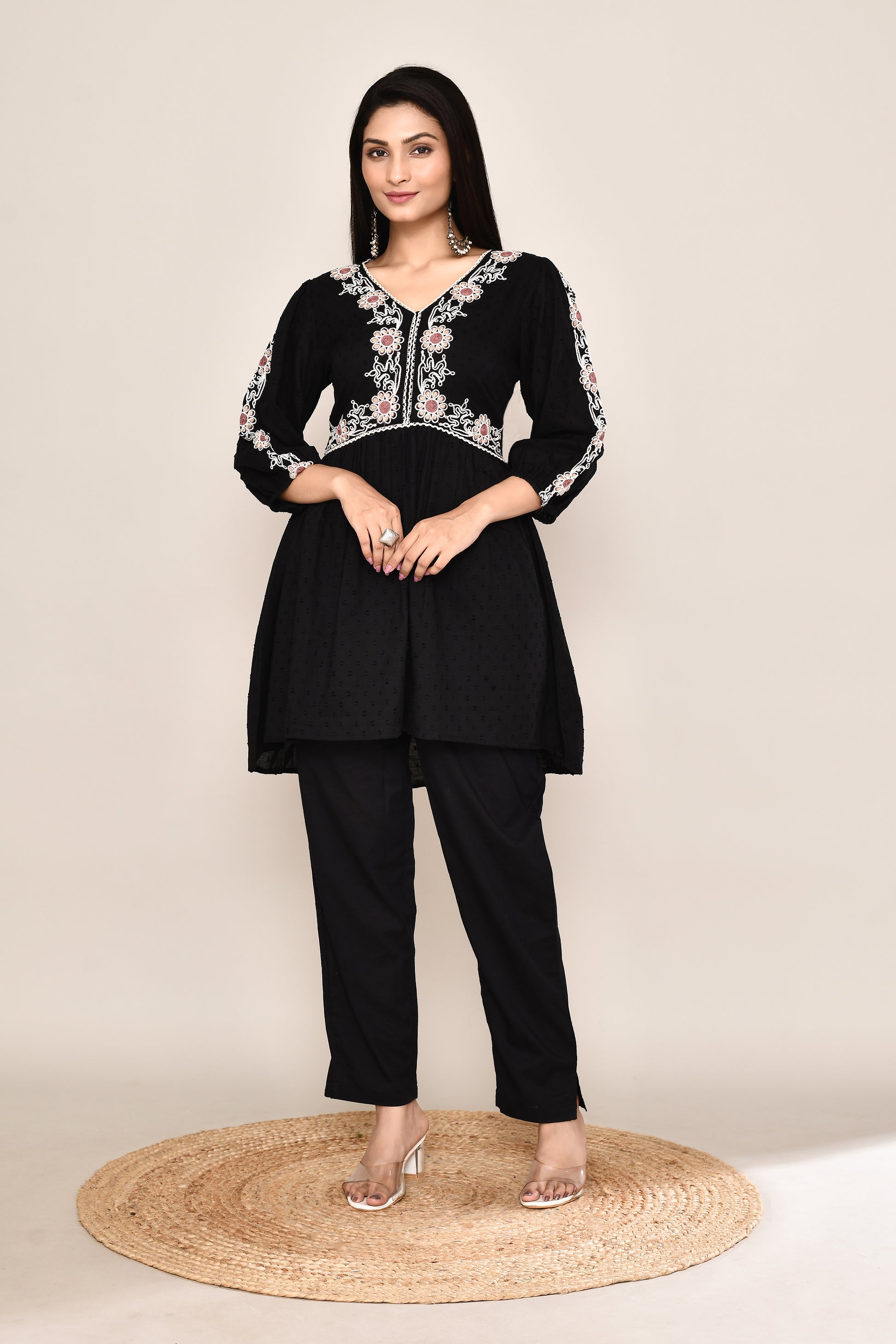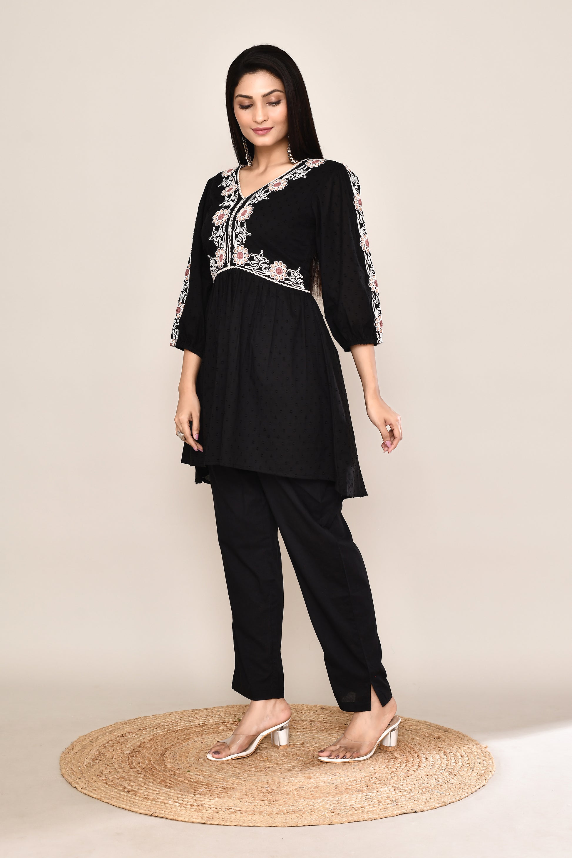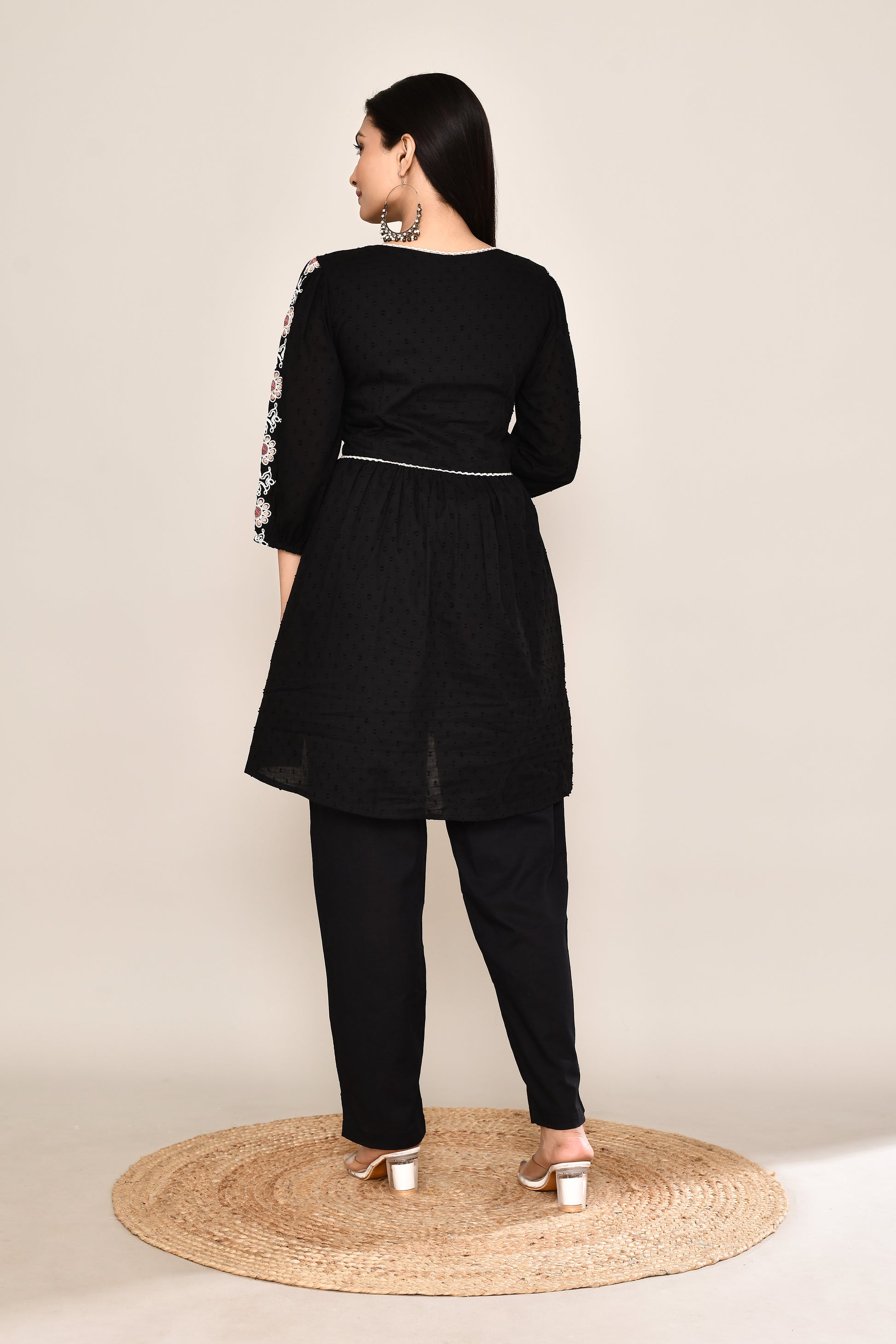Black Dotted Co-ord Set With Woven Neck Embroidery