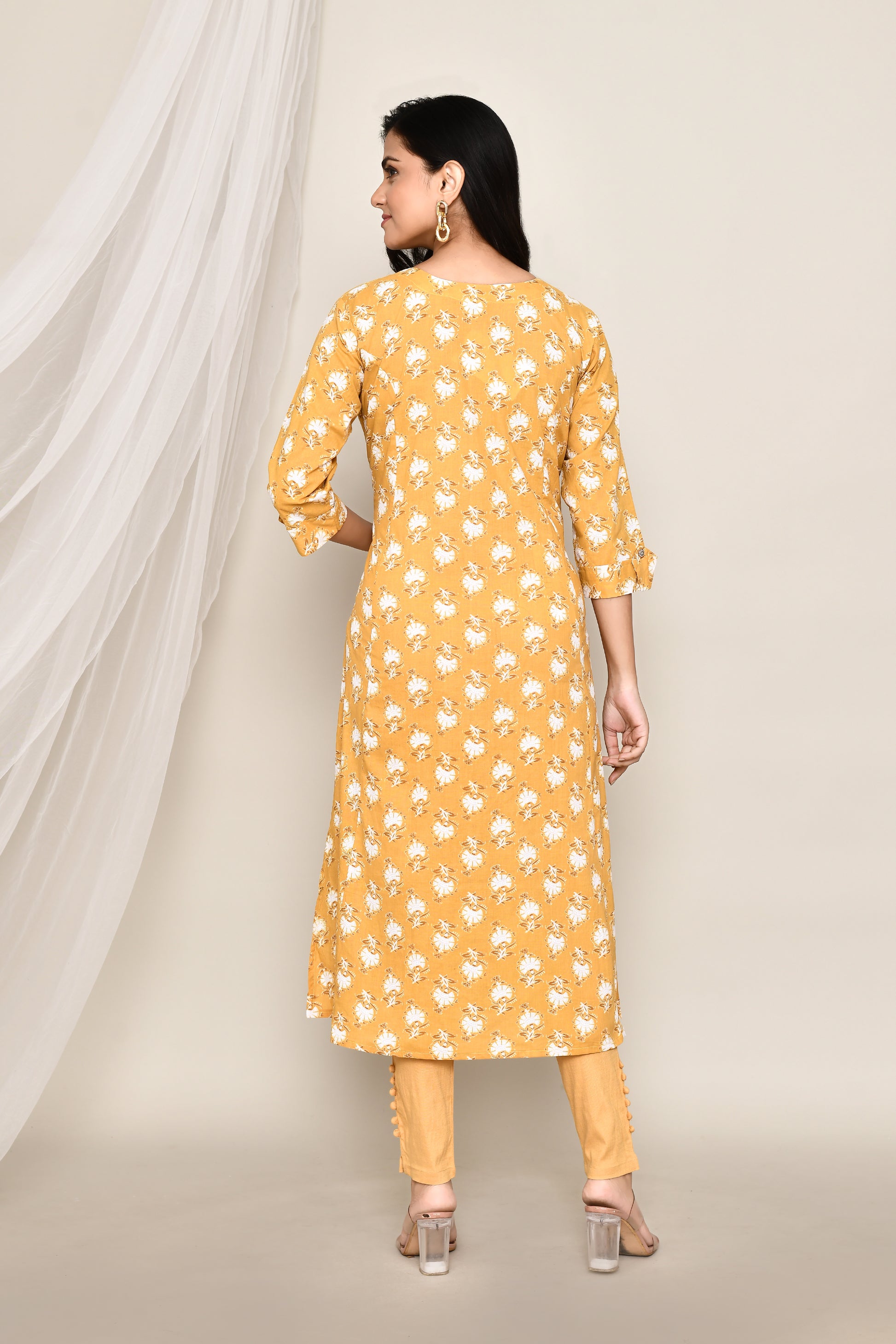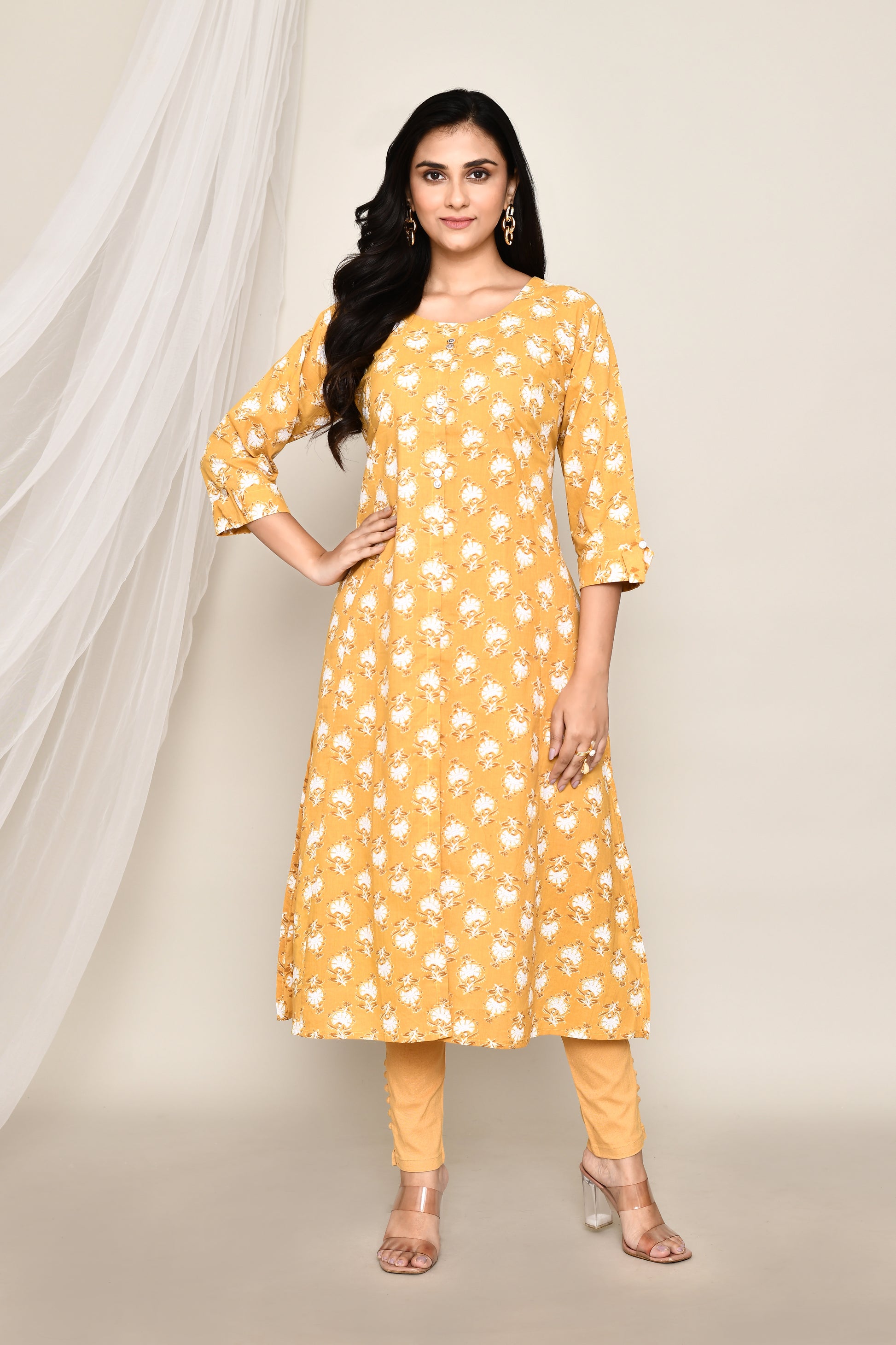 Ochre Yellow Printed A-Line Kurti With Front Slit
