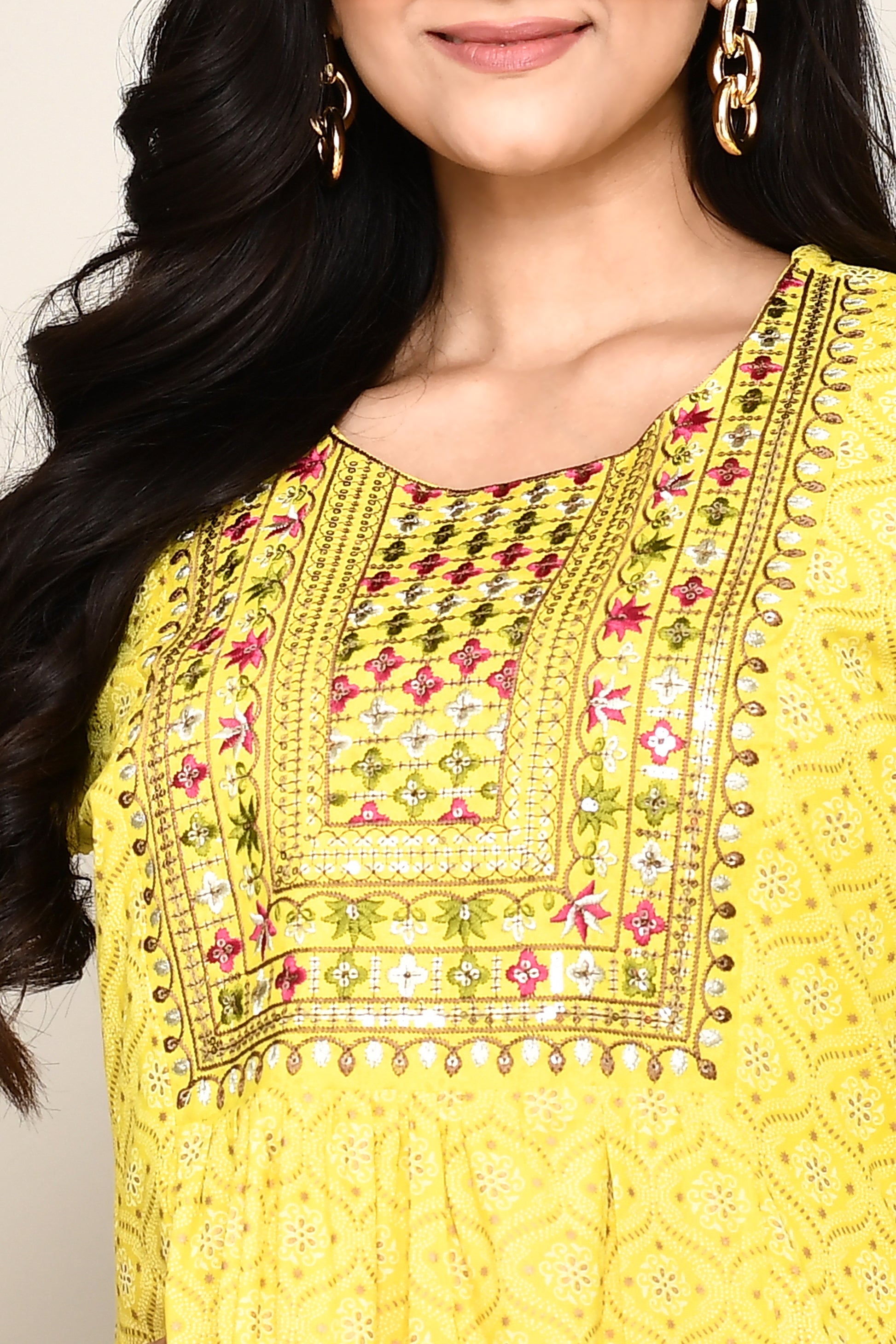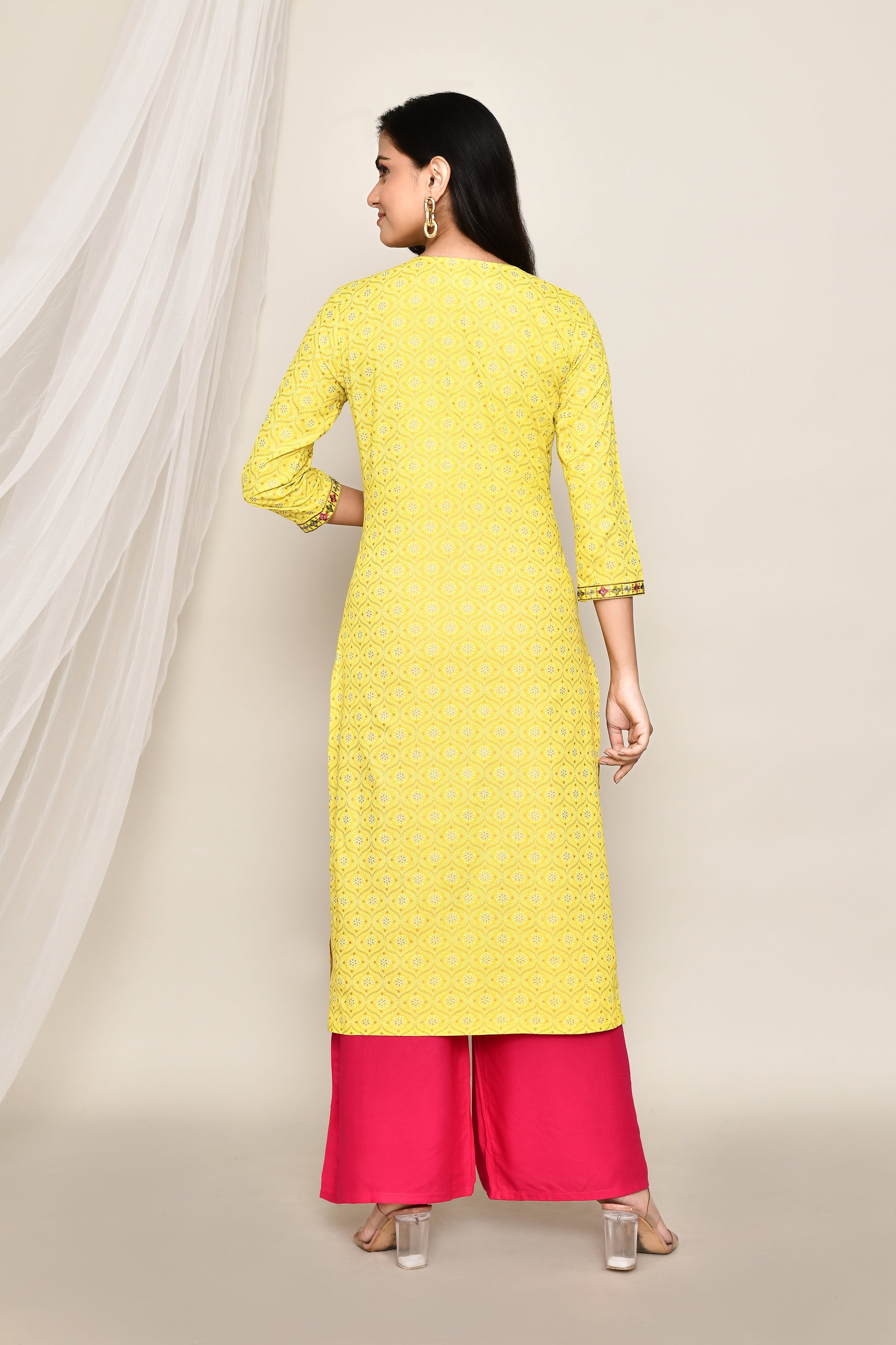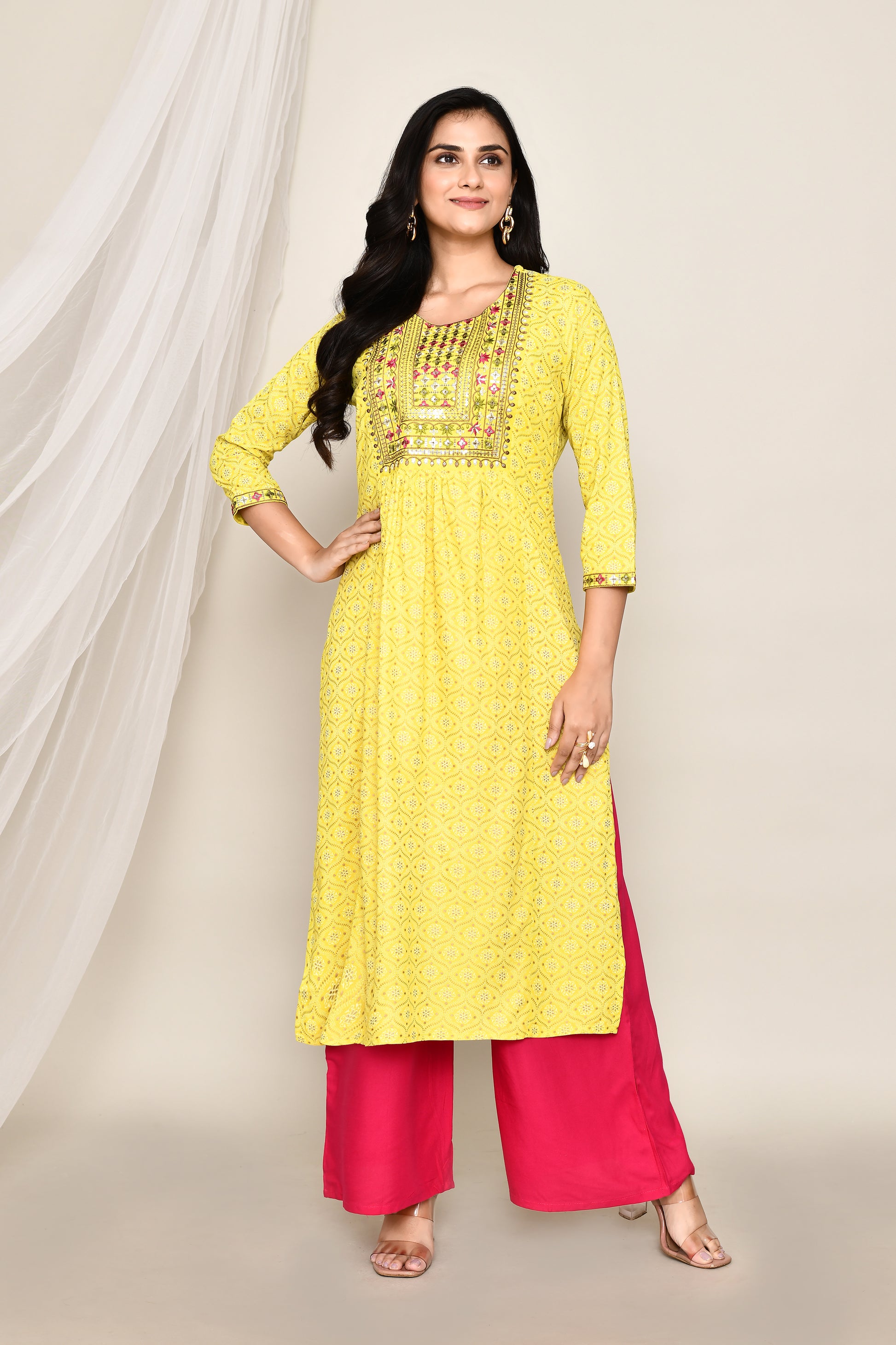 Diamond Printed Lemon Yellow Kurti With Thread Work Neck Embroidery